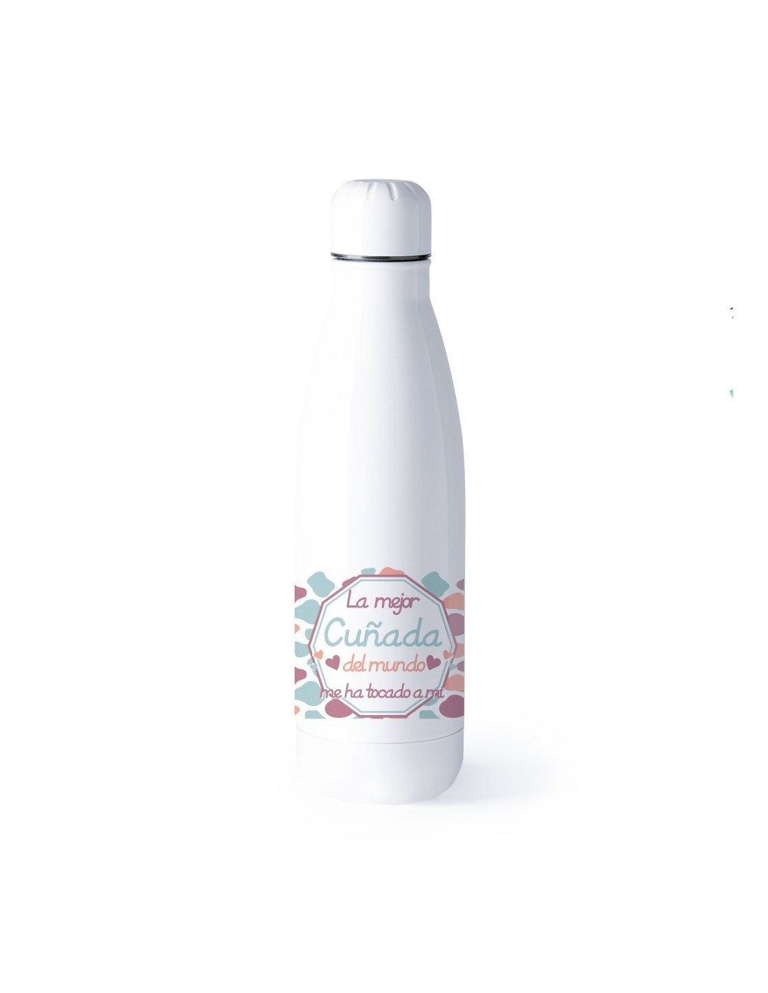 Original y práctico bidón termo con doble pared decorado con el mensaje "la mejor cuñada del mundo me ha tocado a mi".