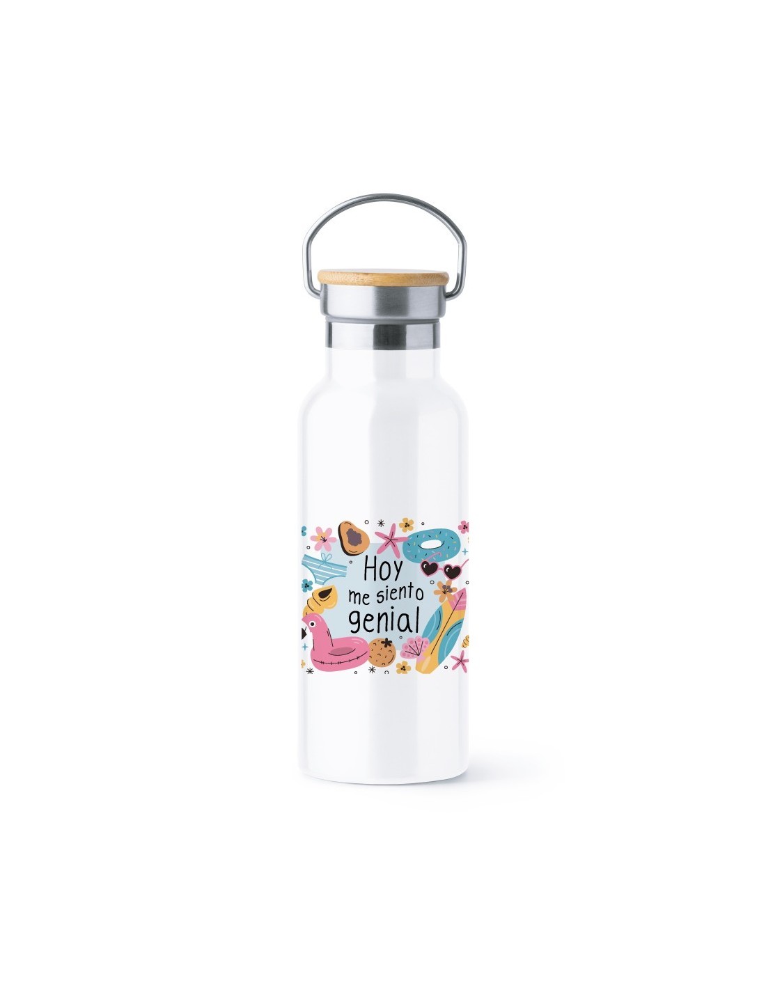 Original y práctico bidón termo con doble pared decorado con el mensaje "hoy me siento genial".