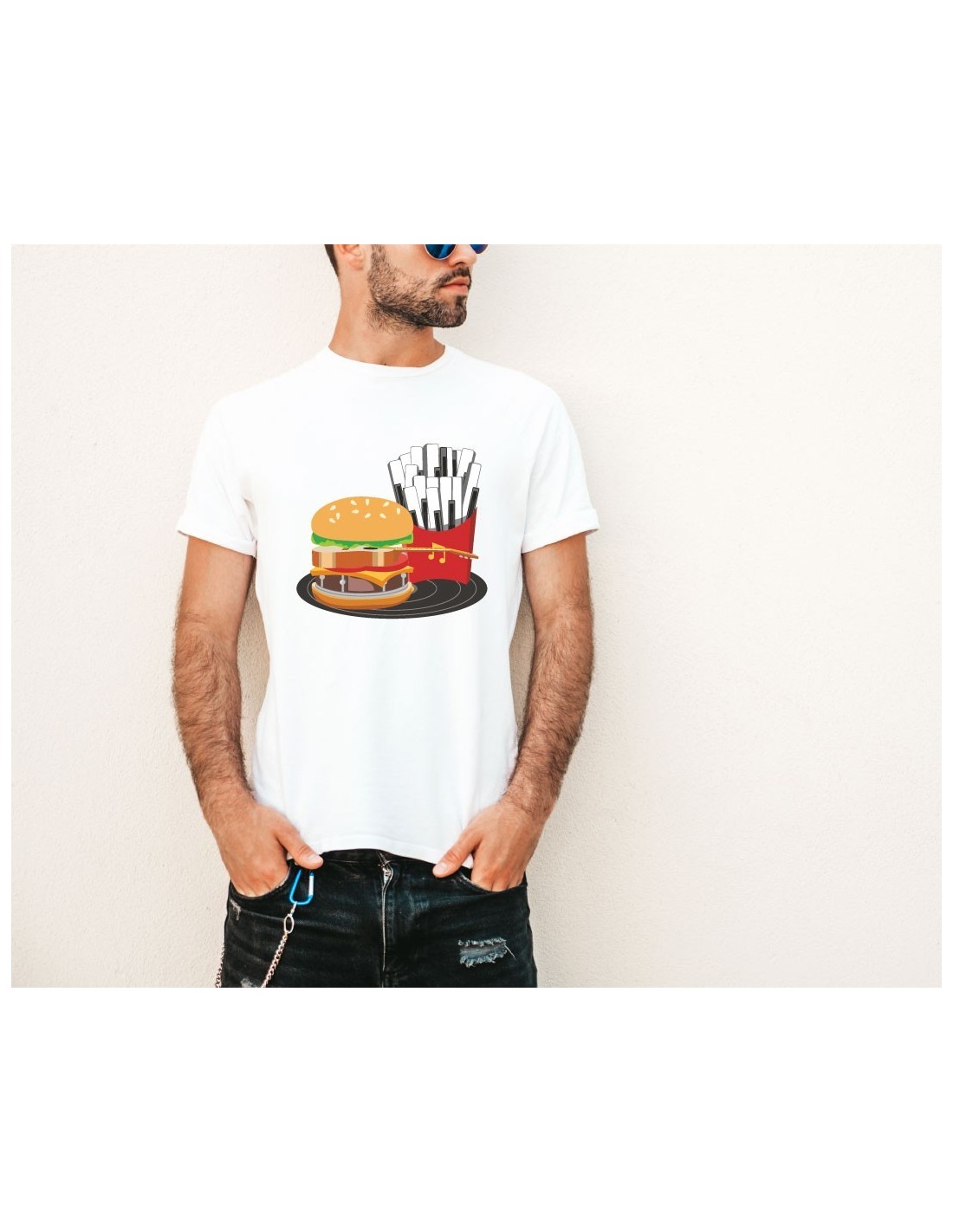 Original camiseta blanca decorada con el dibujo de una comida rápida muy musical.