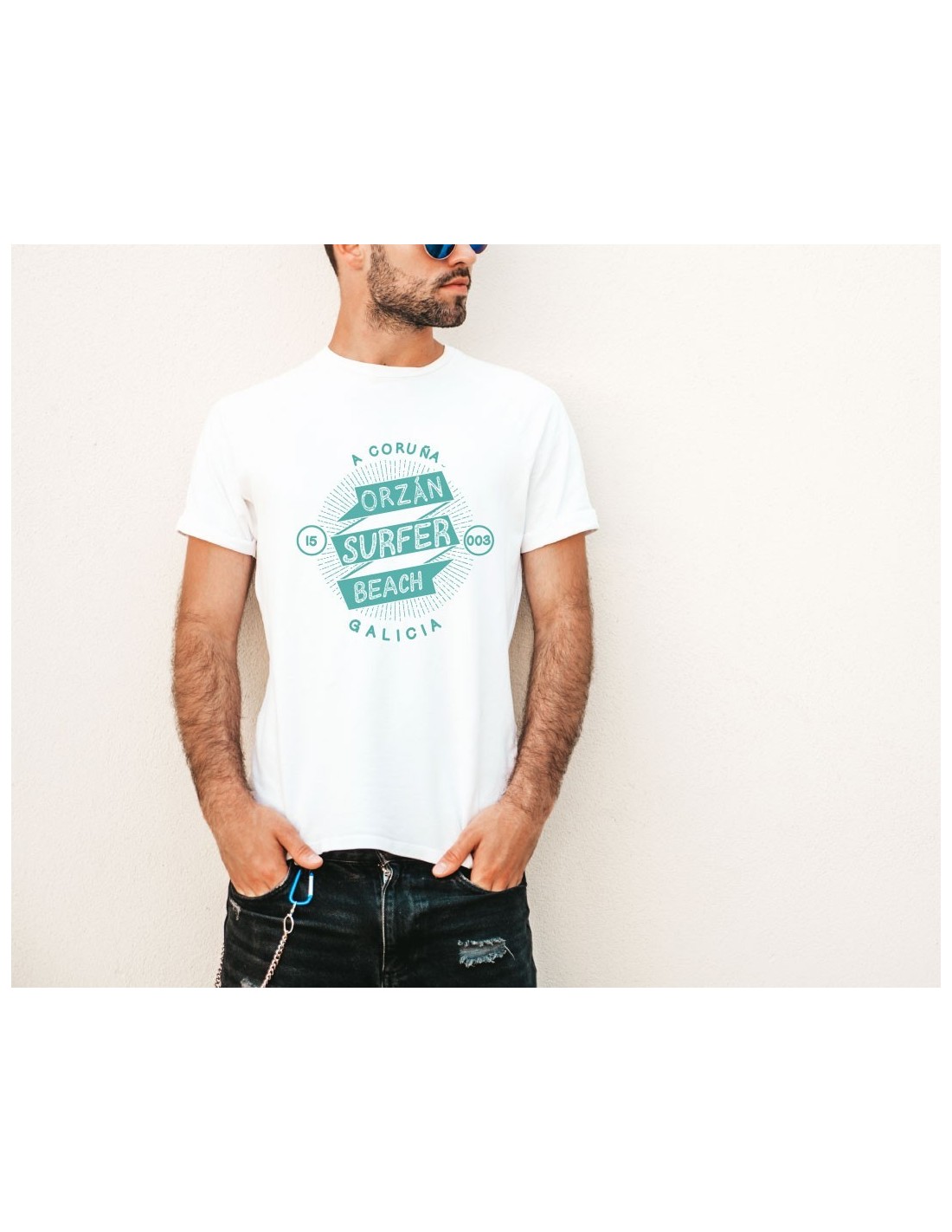 Original camiseta blanca decorada con el texto "Orzán surfer beach".