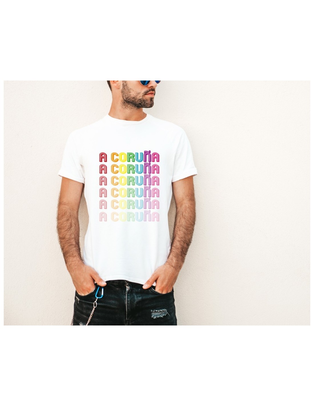 Original camiseta blanca decorada con el texto "A Coruña" a todo color.