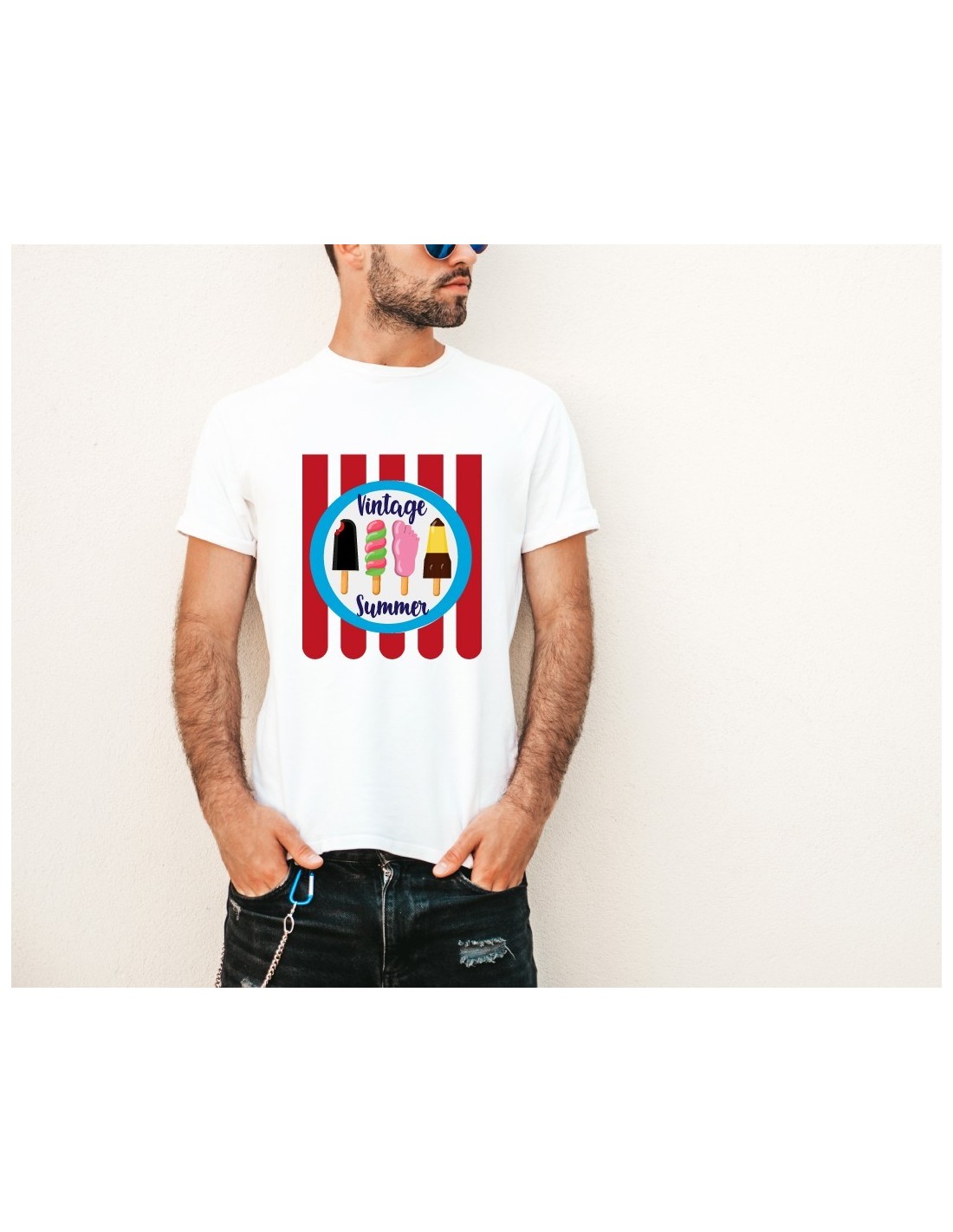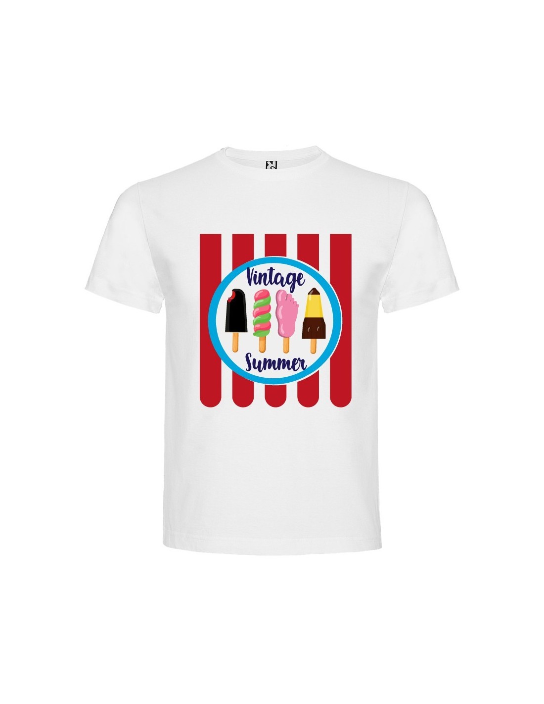 Original camiseta blanca decorada con el dibujo de los clásicos helados de nuestra infancia.