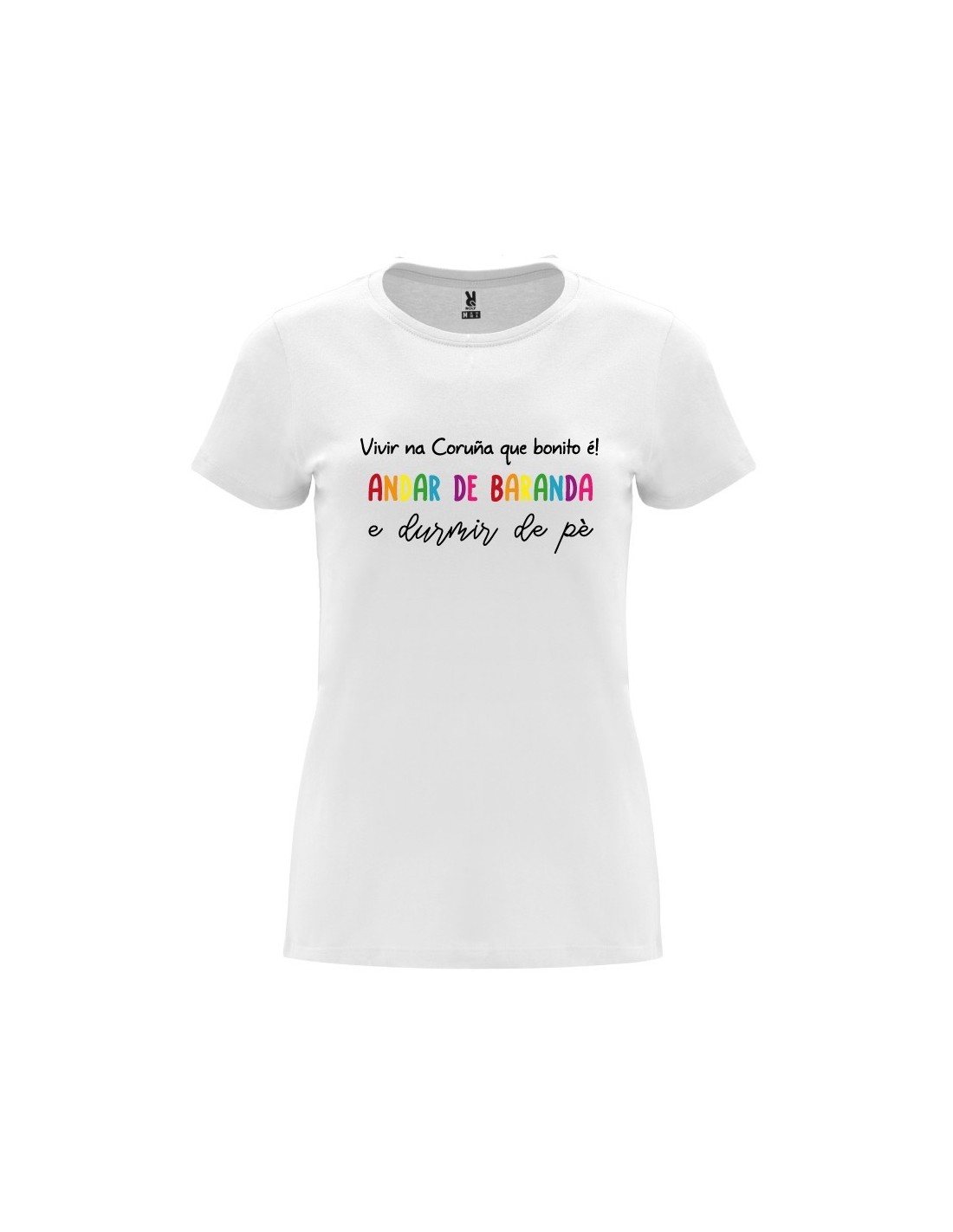 Original camiseta blanca entallada decorada con el mensaje "vivir na Coruña que bonito é, andar de baranda e durmir de pé".