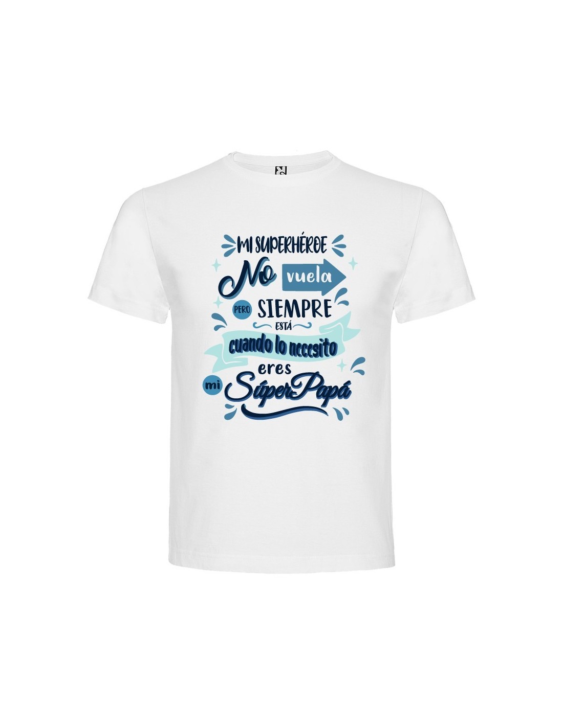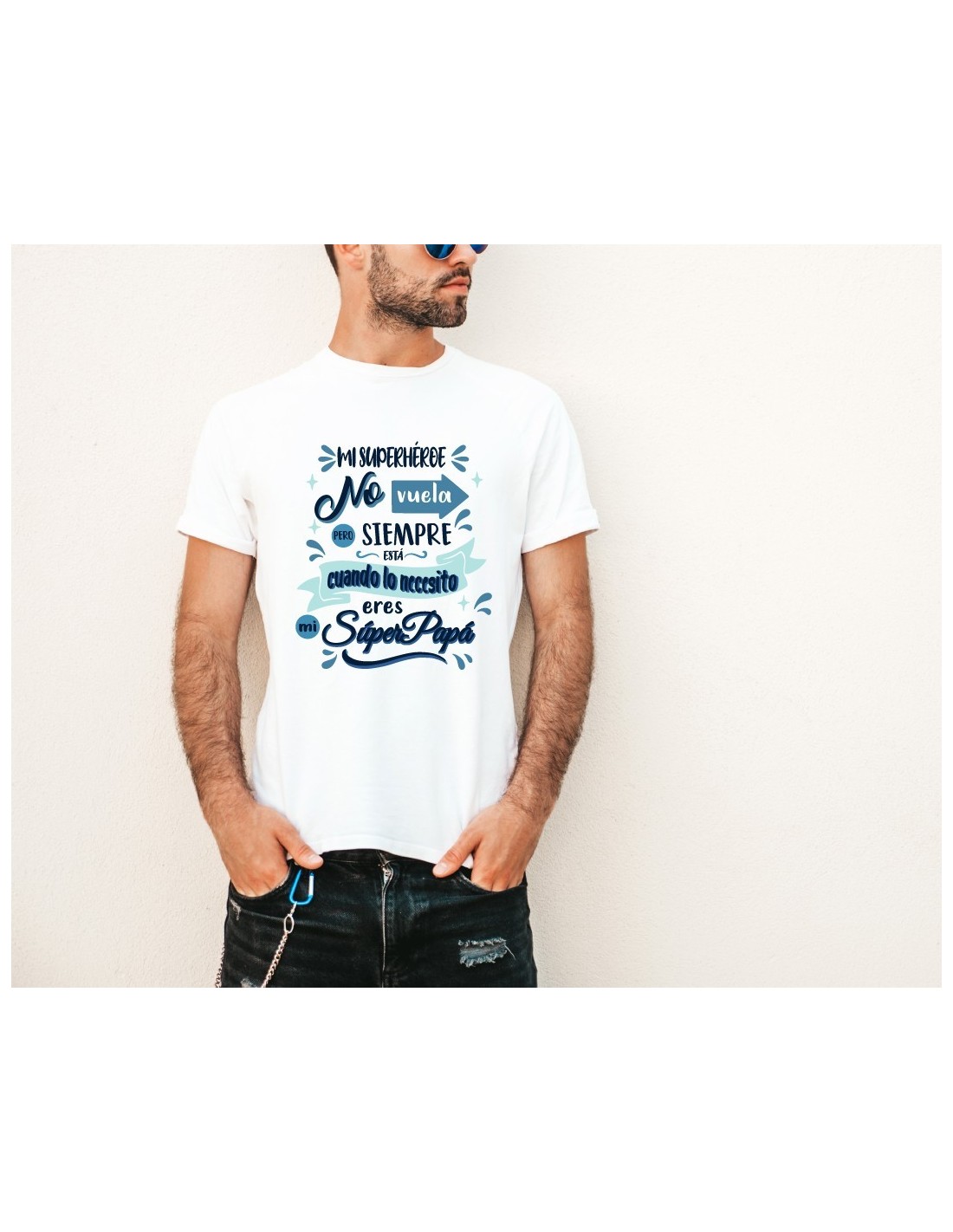 Original camiseta blanca decorada con el mensaje "mi superhéroe no vuela pero siempre está cuando lo necesito, eres mi súper papá".