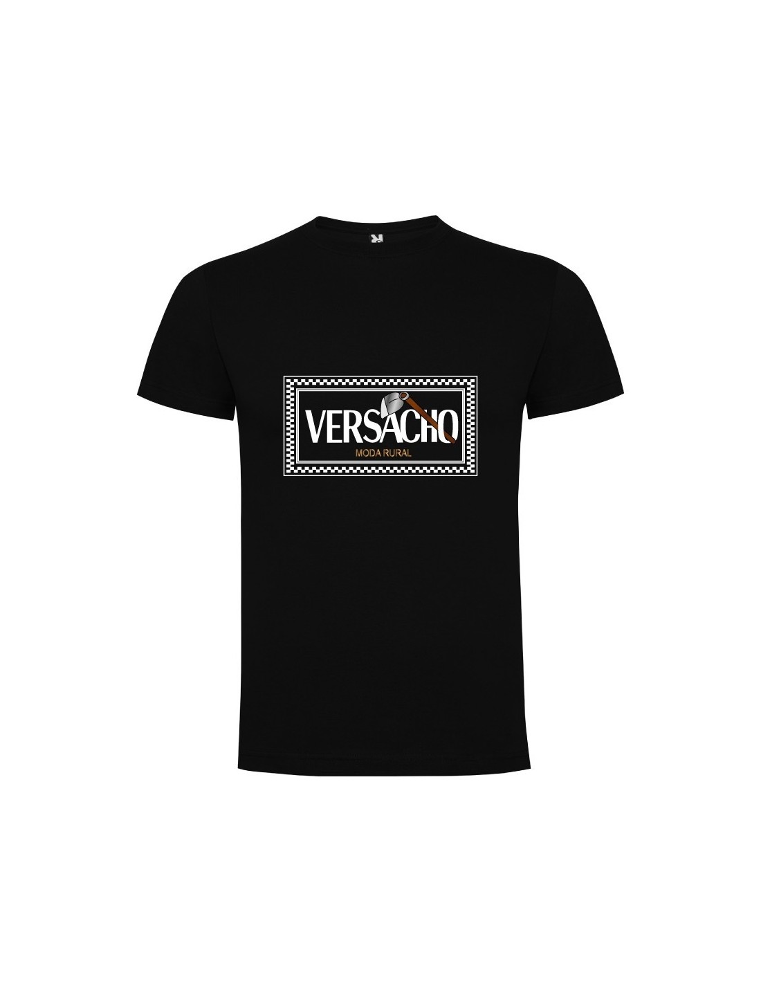 Original camiseta negra decorada el texto Versacho, moda rural a modo de logotipo de firma.