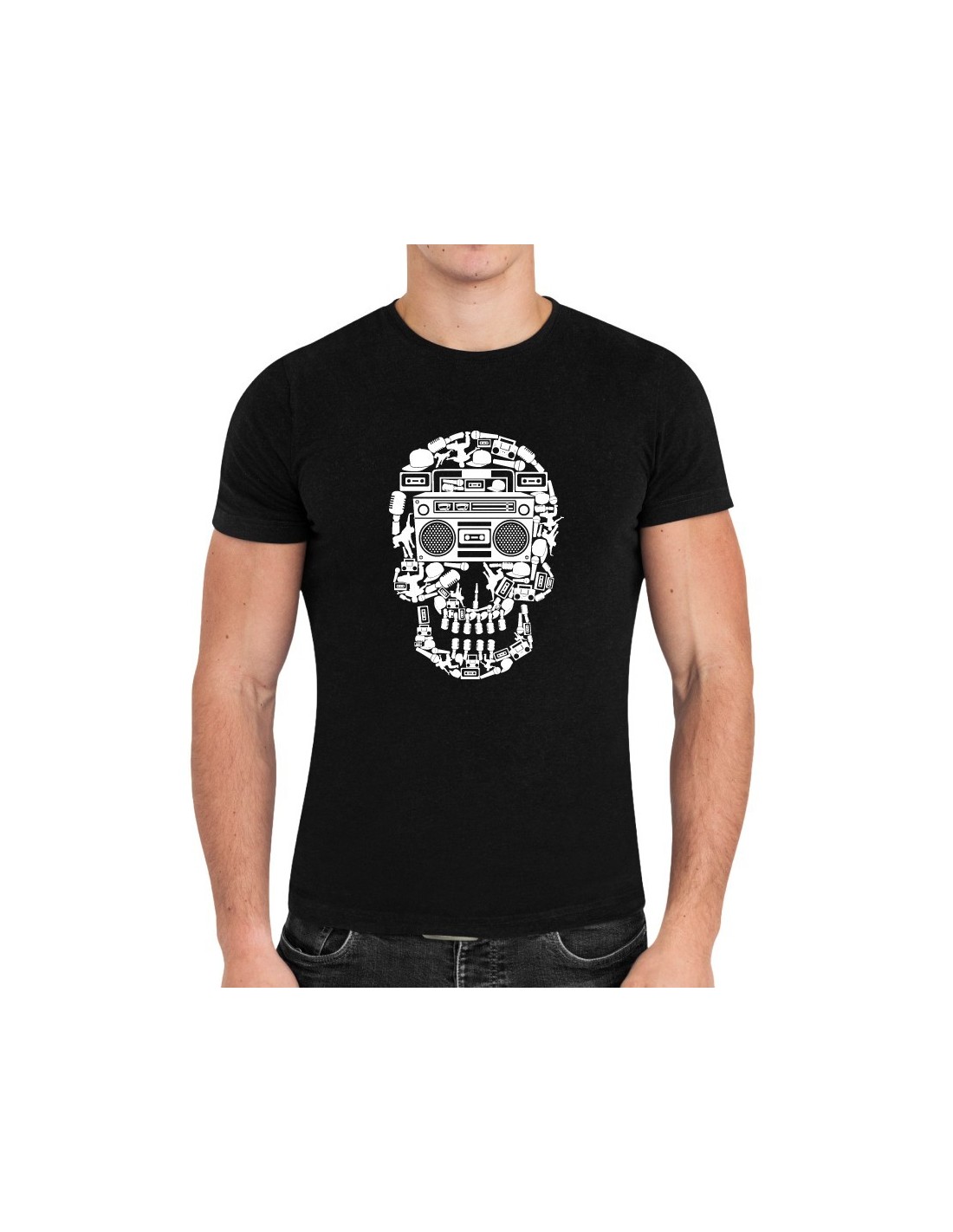 Original camiseta negra decorada con el dibujo de una calavera formada con elementos musicales.