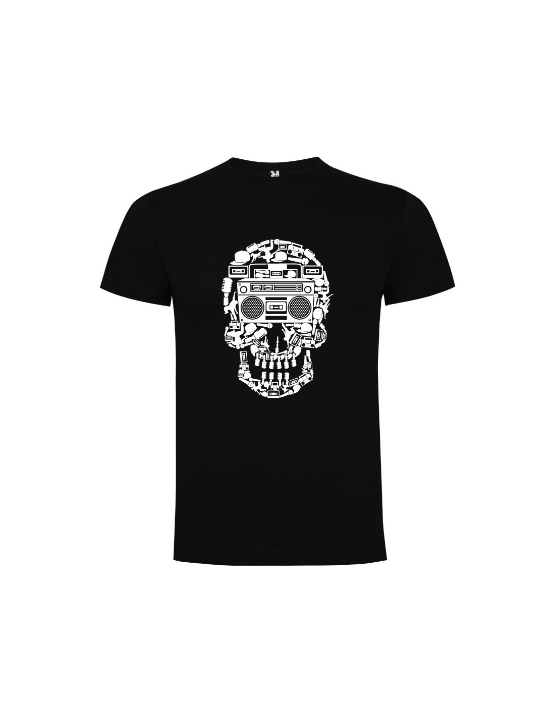 Original camiseta negra decorada con el dibujo de una calavera formada con elementos musicales.
