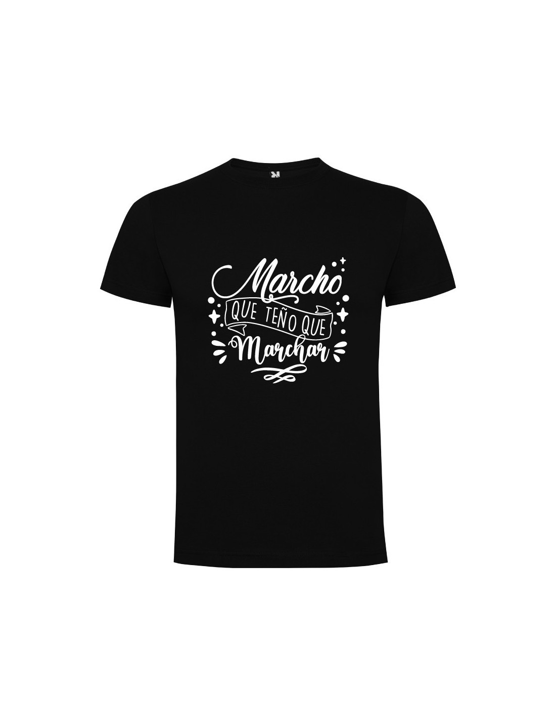 Original camiseta negra decorada con el texto "marcho que teño que marchar"