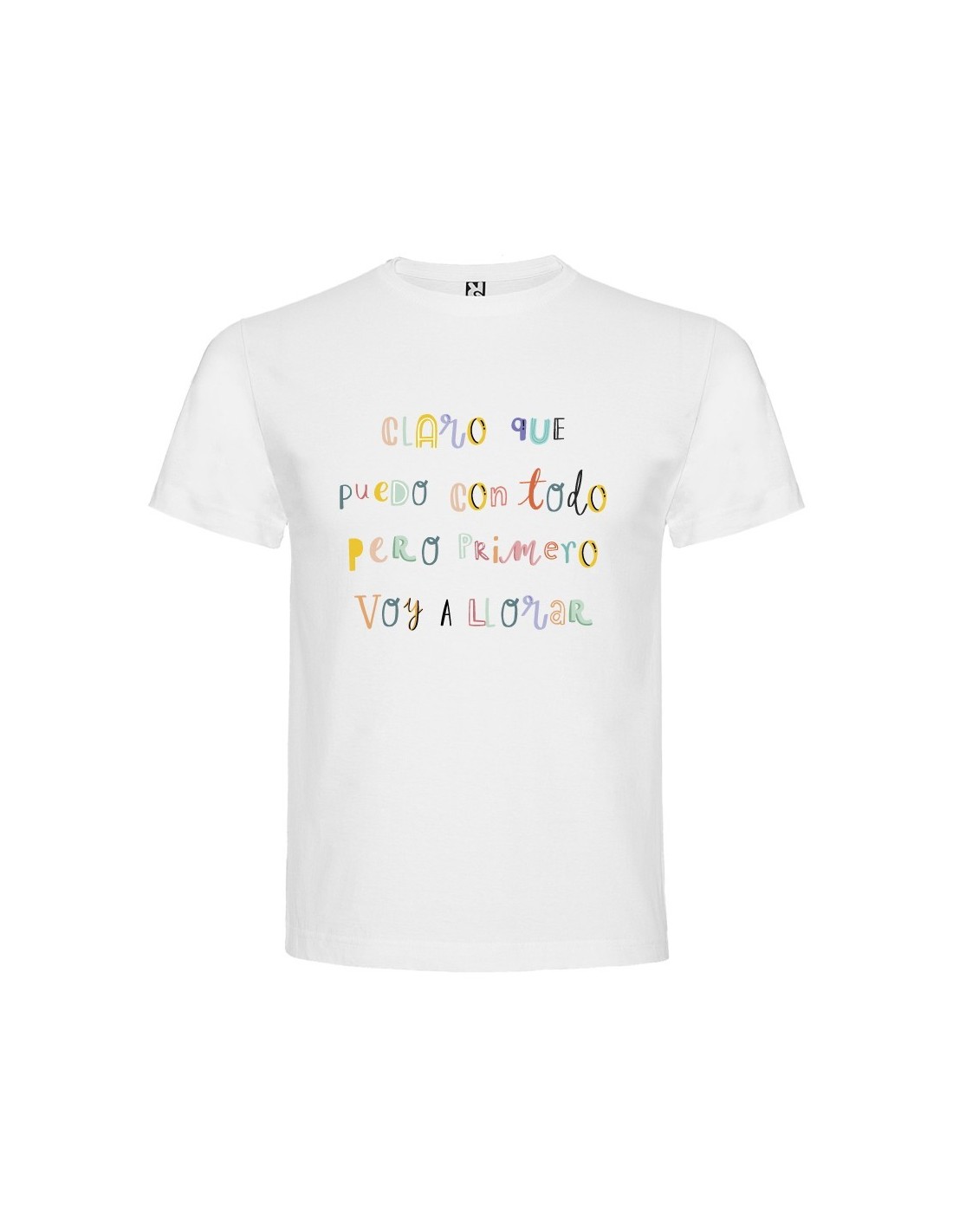 Original camiseta blanca decorada con el dibujo de un avión y el mensaje "claro que puedo con todo pero primero voy a llorar".