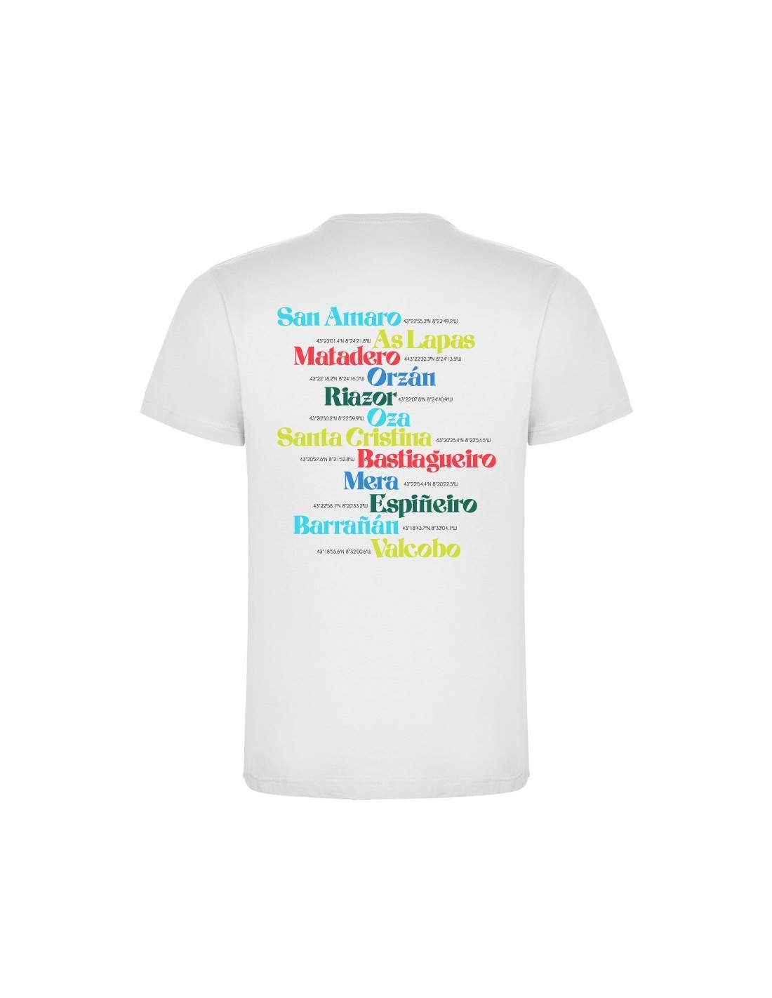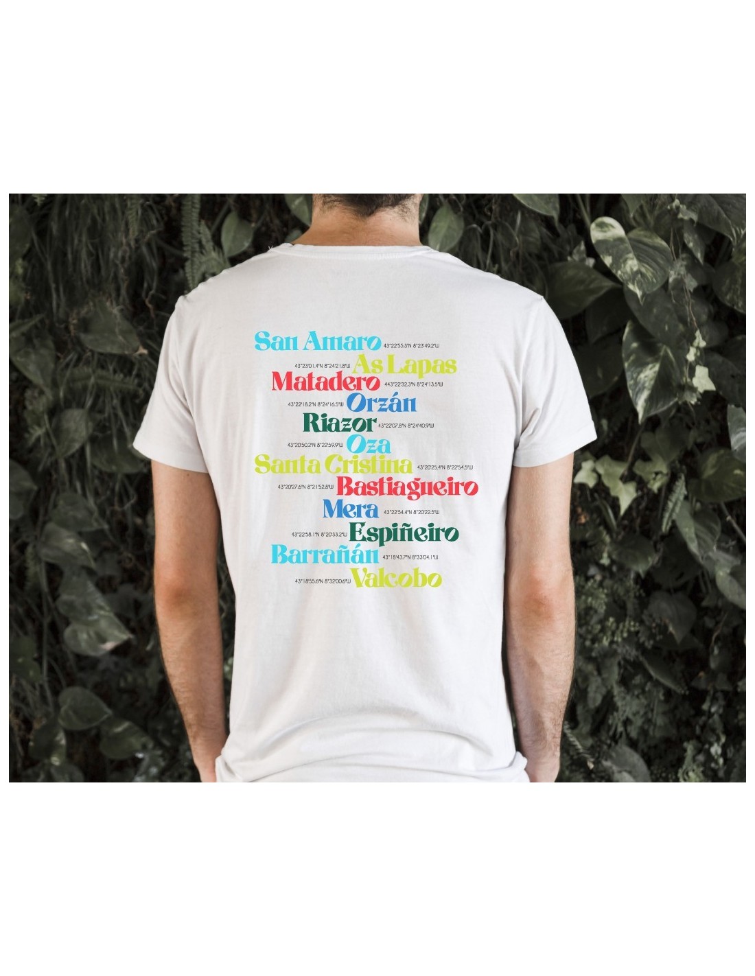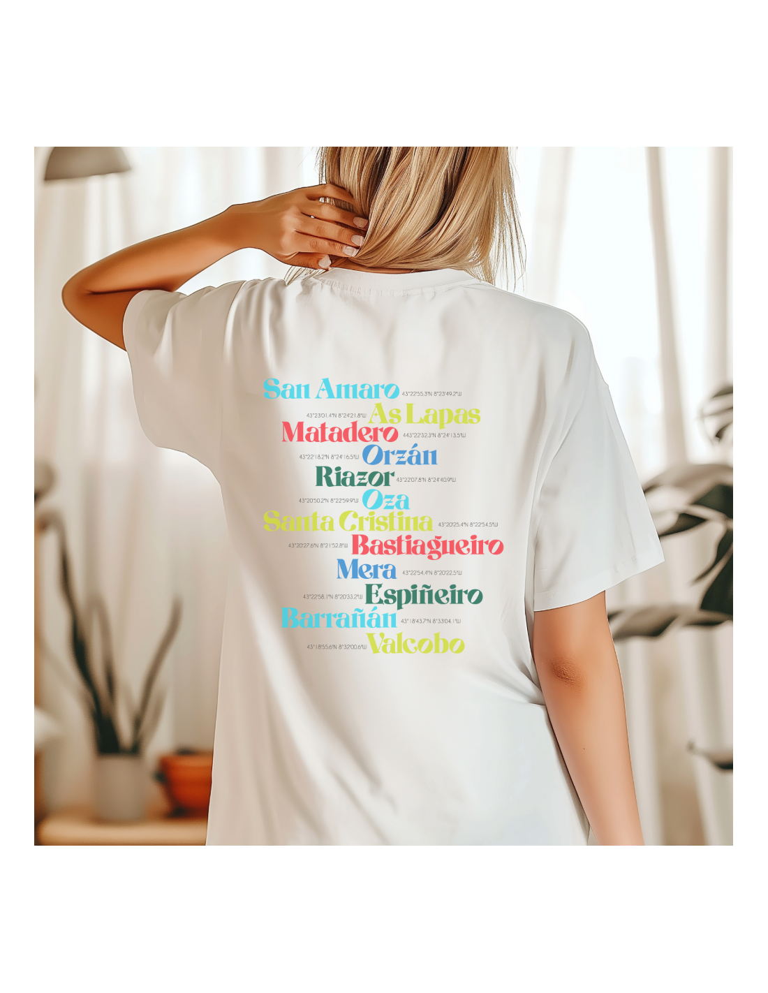 Original camiseta blanca decorada con los nombres y coordenadas de las playas de Coruña y alrededores.