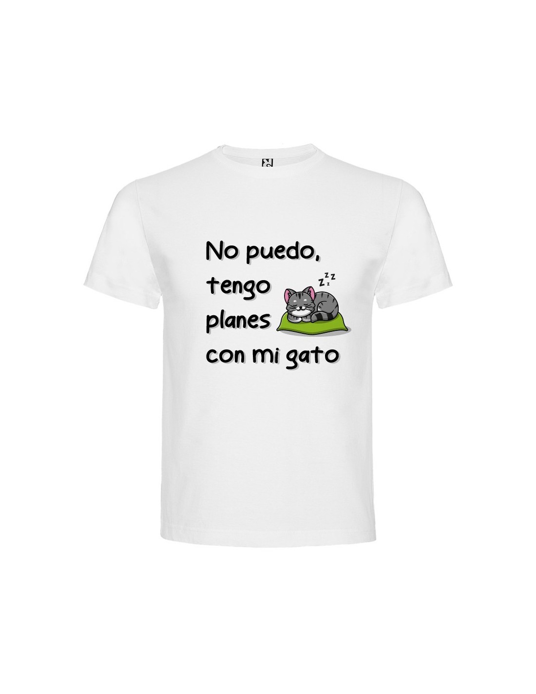 Original camiseta blanca decorada con el mensaje "no puedo, tengo planes con mi gato".