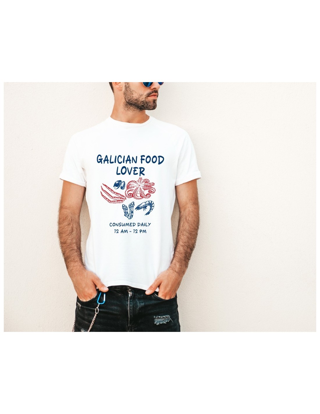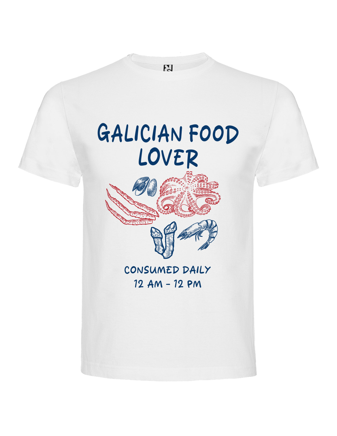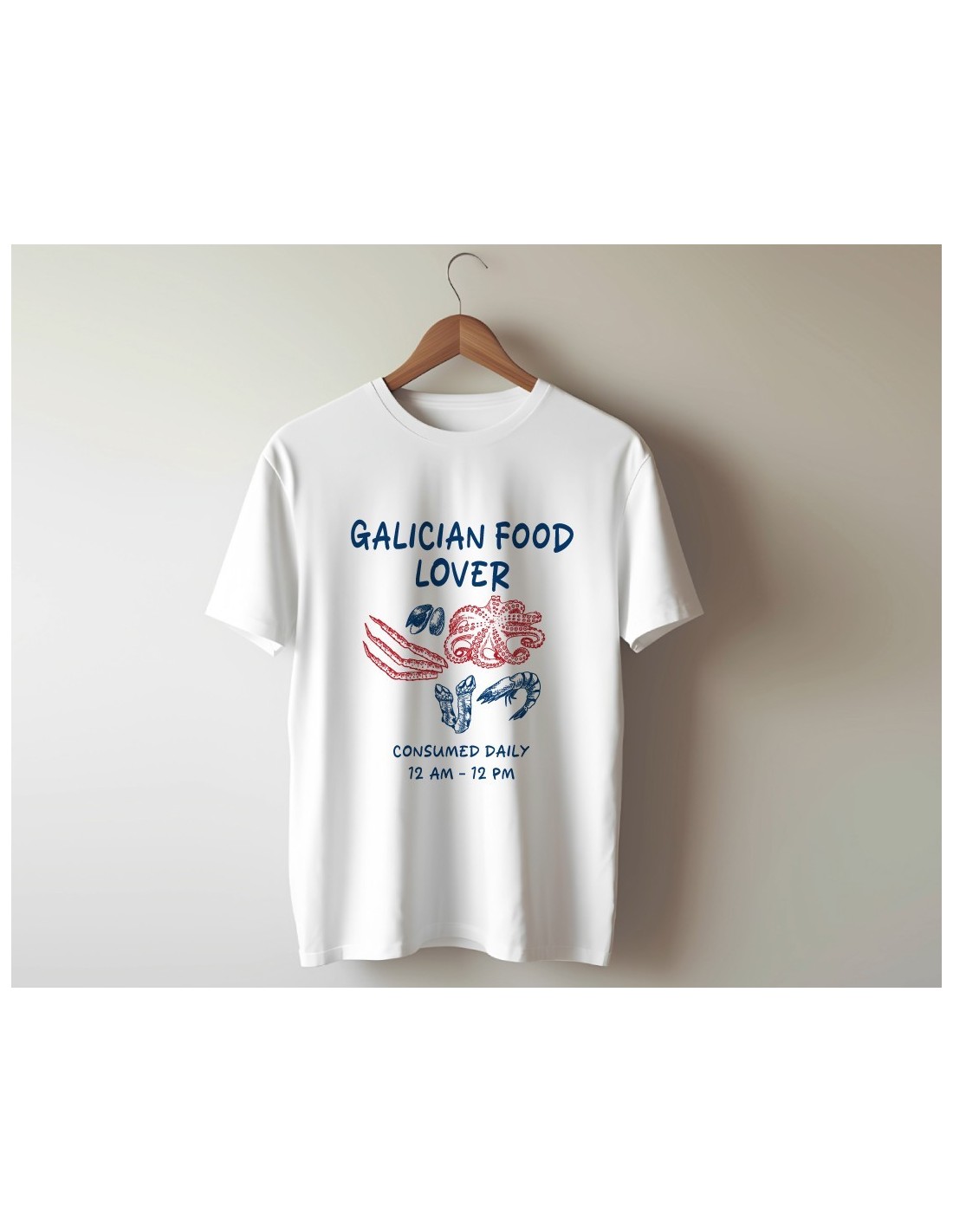 Original camiseta blanca decorada con el mensaje "galician food lover".