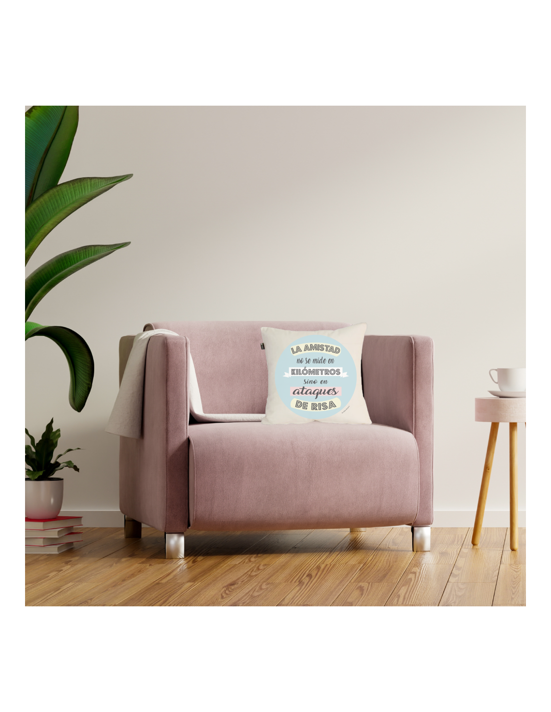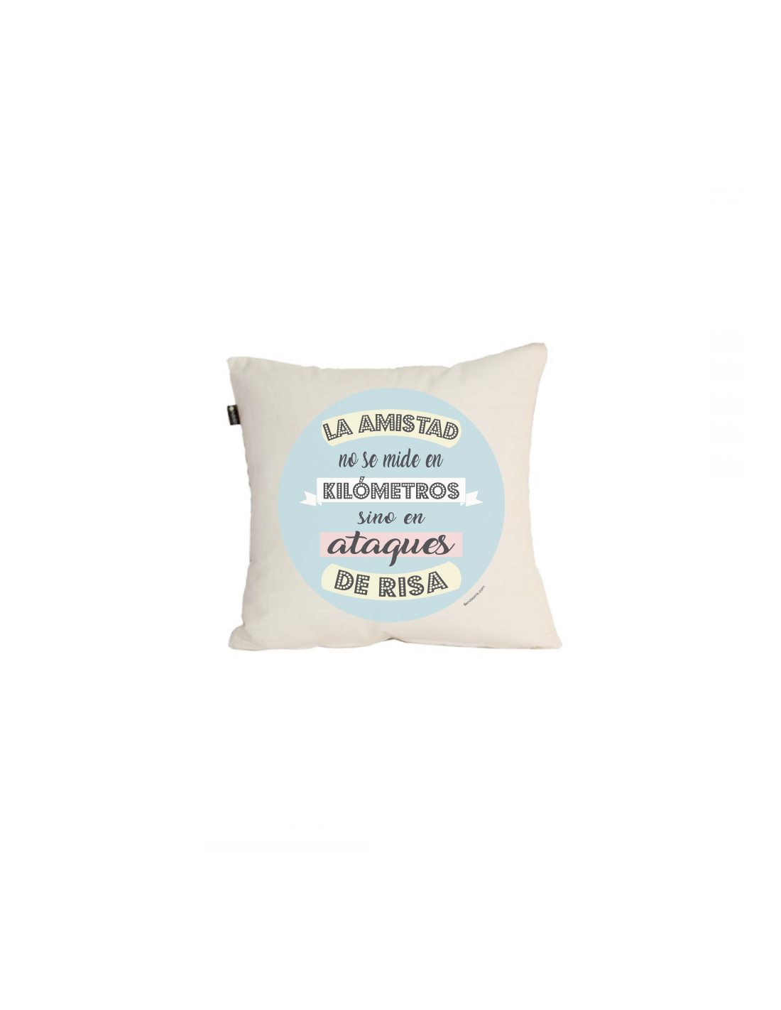 Original cojín decorativo de algodón decorado con el mensaje "la amistad no se mide el kilómetros, sino en ataques de risa".