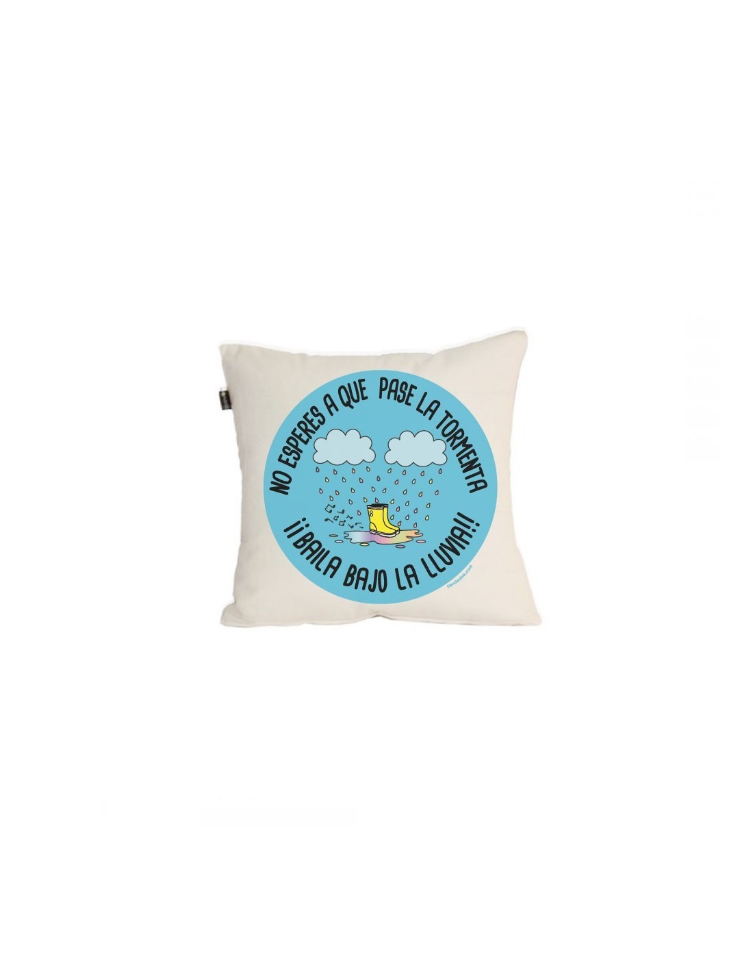 Original cojín decorativo de algodón decorado con el mensaje "no esperes a que pase la tormenta, ¡baila bajo la lluvia!!".
