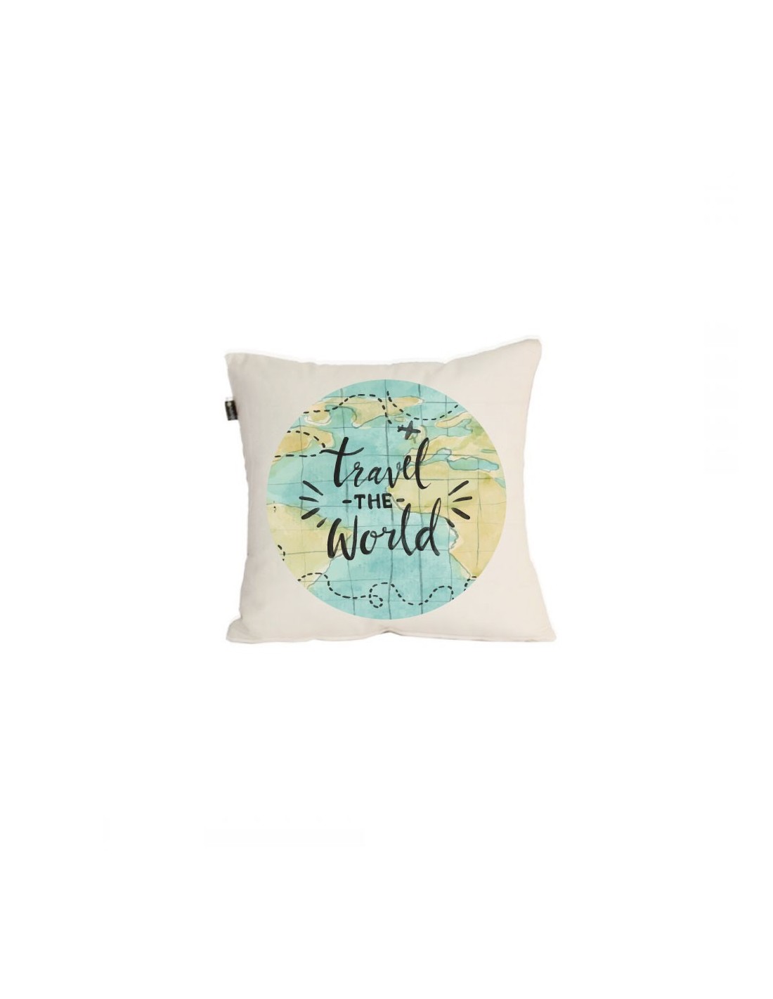 Original cojín decorativo de algodón decorado con el mensaje "travel the world".