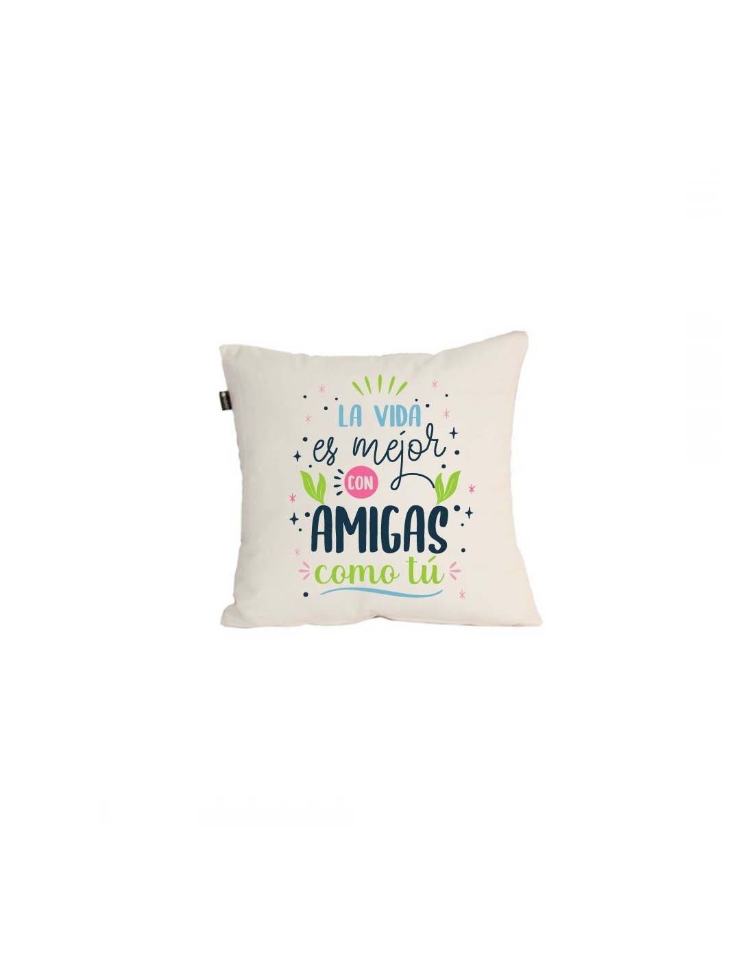 Original cojín decorativo de algodón decorado con el mensaje "la vida es mejor con amigas como tú".