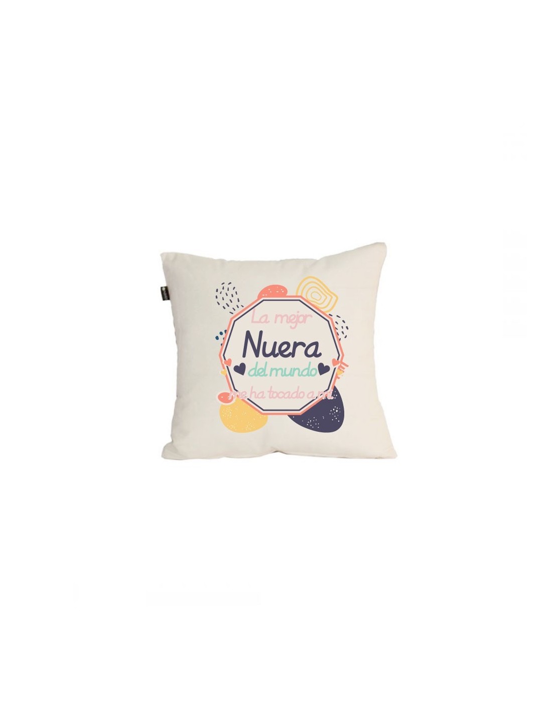 Original cojín decorativo de algodón decorado con el mensaje "la mejor nuera del mundo me ha tocado a mi".