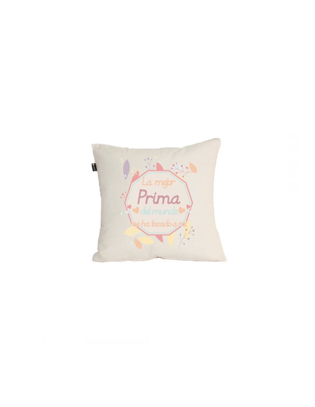 Original cojín decorativo de algodón decorado con el mensaje "la mejor prima del mundo me ha tocado a mi".