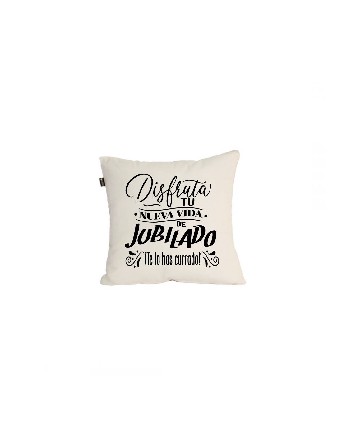 Original cojín decorativo de algodón decorado con el mensaje "Disfruta tu nueva vida de jubilado ¡te lo has currado!".