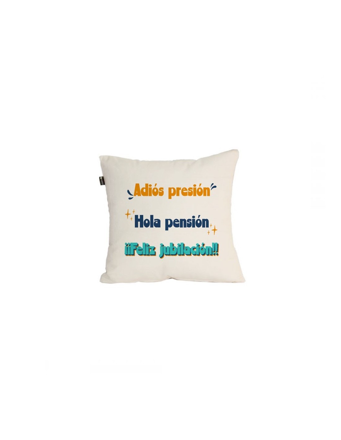 Original cojín decorativo de algodón decorado con el mensaje "Adiós presión, hola pensión ¡¡feliz jubilación!!".