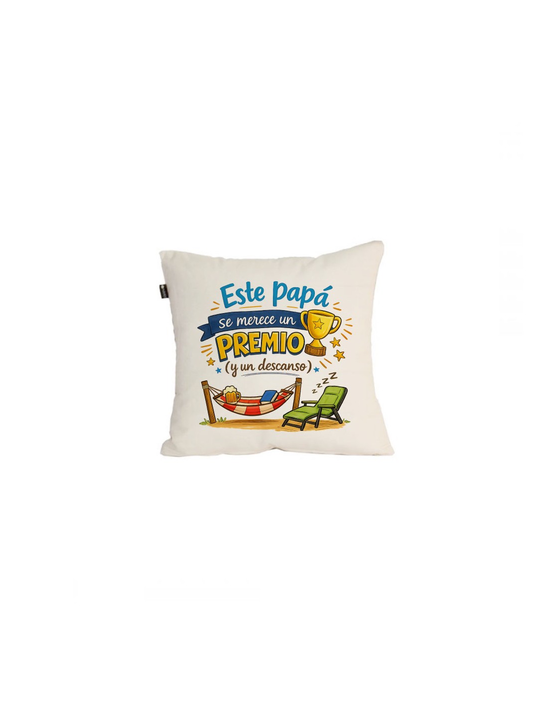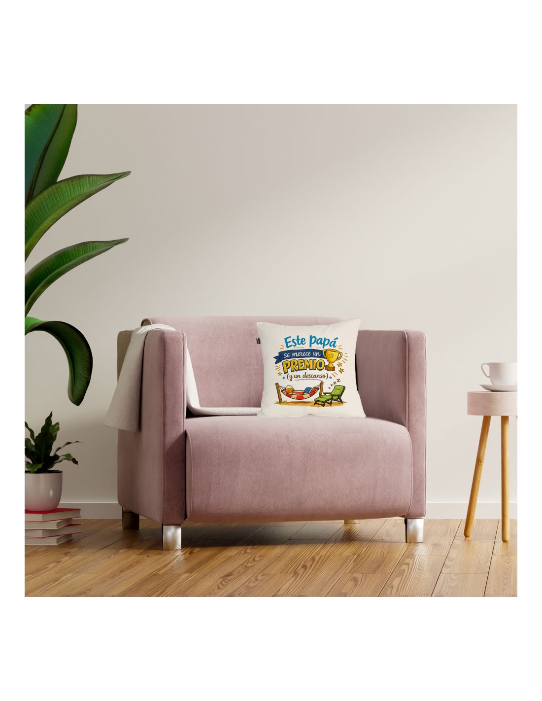 Original cojín decorativo de algodón decorado con el mensaje "este papá se merece un premio (y un descanso)".
