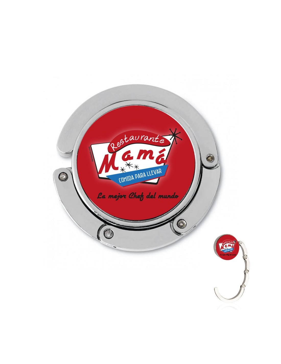 Original cuelgabolso plegable con mensaje "Restaurante Mamá. Comida para llevar".