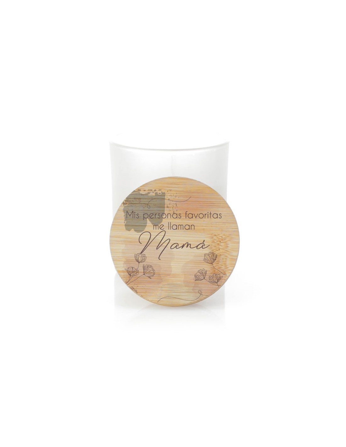 Original vela aromática en vaso decorada con el texto "mis personas favoritas me llaman mamá" en la tapa.