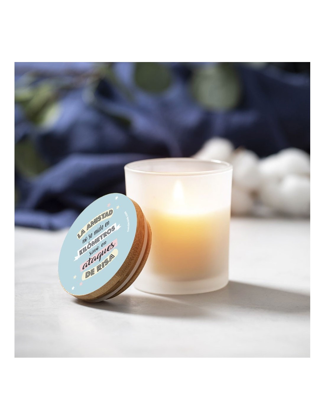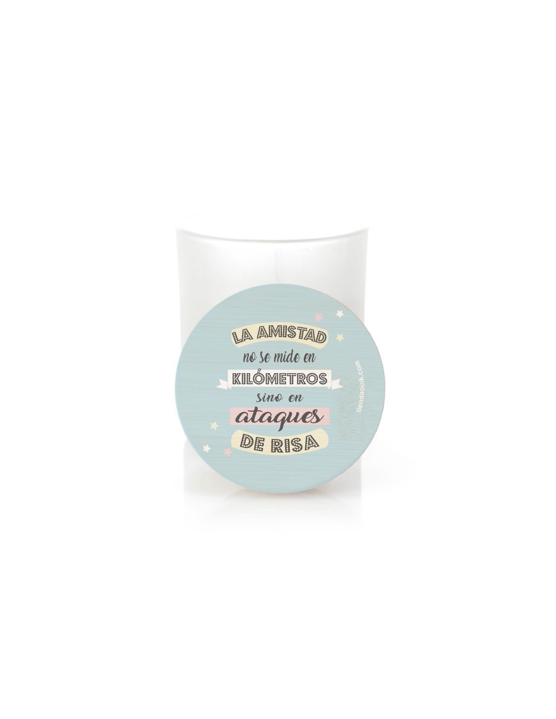Original vela aromática en vaso decorada con el mensaje "la amistad no se mide en kilómetros sino en ataques de risa" en la tapa.