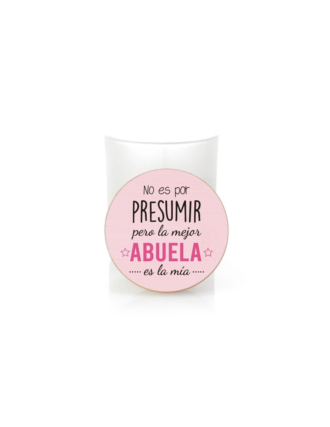 Original vela aromática en vaso decorada con el mensaje "no es por presumir pero la mejor abuela es la mía" en la tapa.