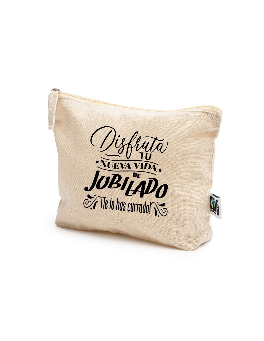Práctico y ligero neceser de algodón con cierre de cremallera decorado con el mensaje "Disfruta tu nueva vida de jubilado ¡te lo has currado!".