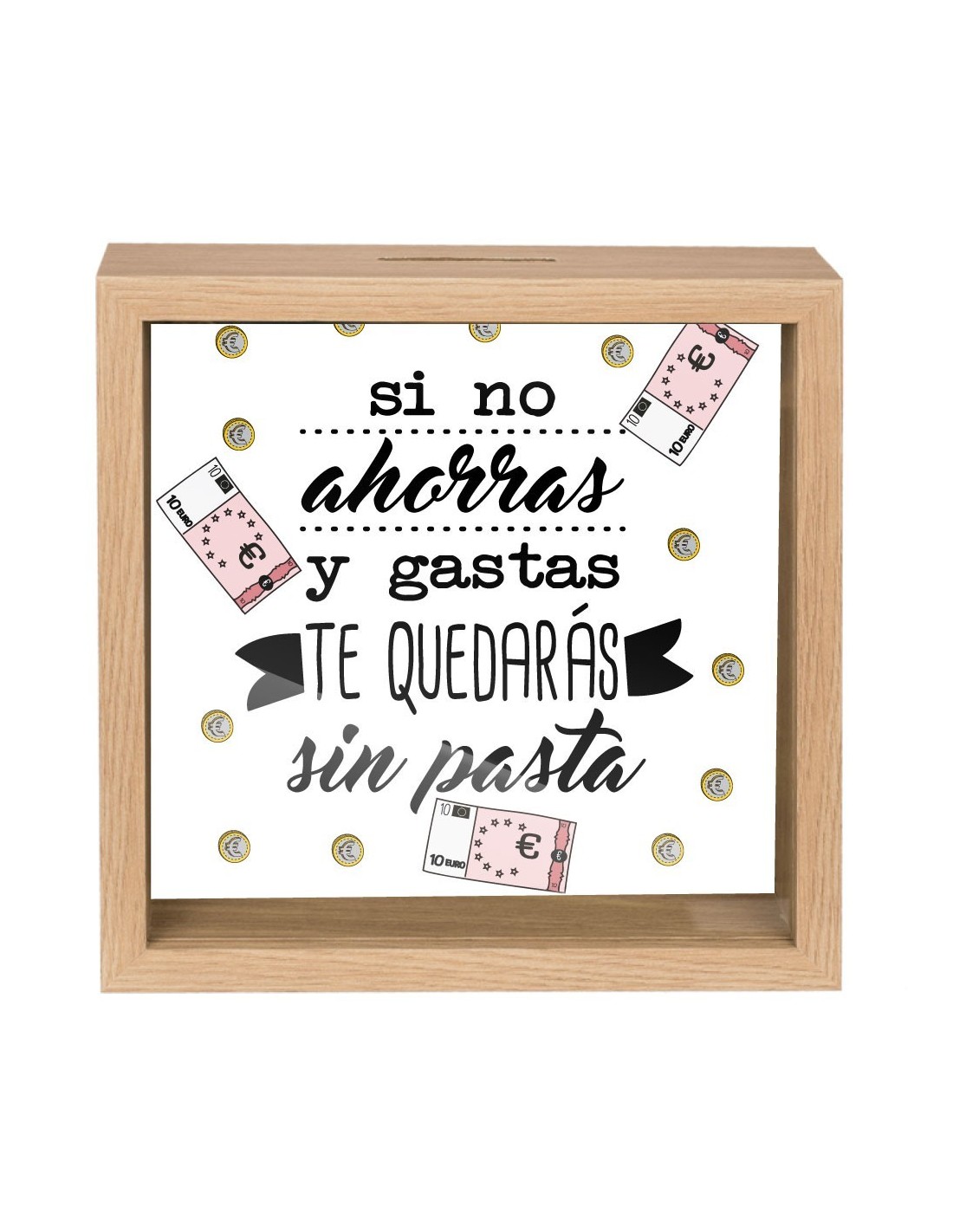 Original hucha de madera decorada con el texto "si no ahorras y gastas te quedarás sin pasta".