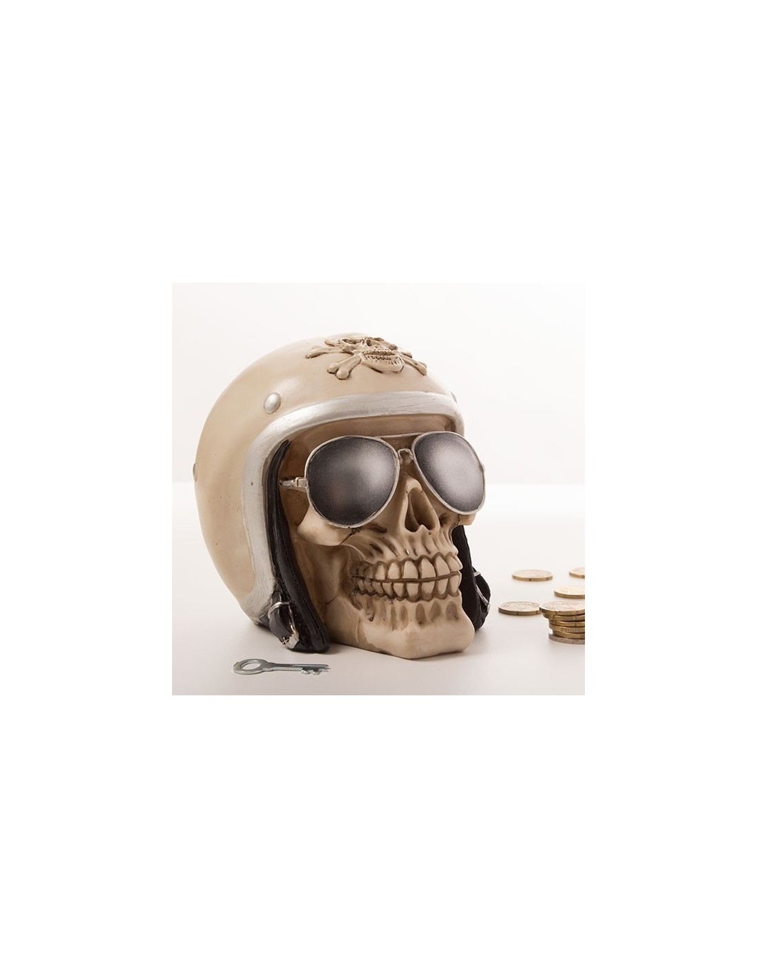 Original hucha en forma de calavera con casco de motorista. Dispone de una ranura en la parte superior para introducir el dinero y un tapón con llave en la parte inferior para vaciarla. Un gadget perfecto para regalar a los más motoristas.