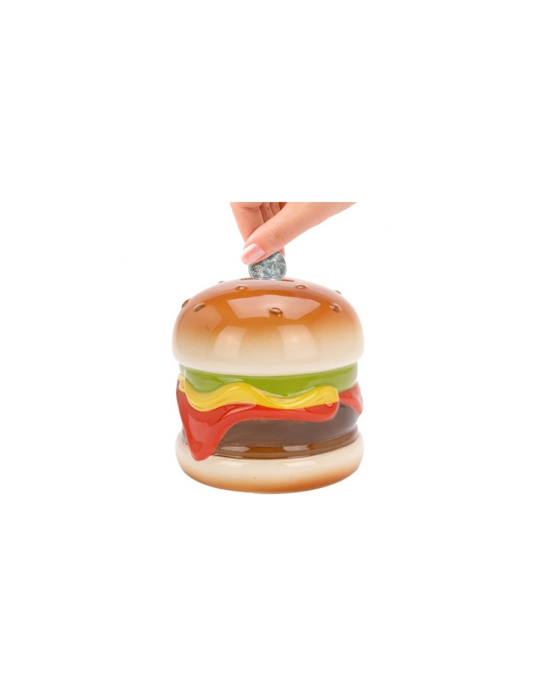 Original hucha con forma de hamburguesa con un diseño tan logrado que dan ganas de darle un mordico. Esta hucha está fabricada en cerámica, con una ranura en la parte superior y un orificio de acceso, sellado con un tapón de plástico blando en la parte inferior. Esta hucha hamburguesa es la forma más apetitosa de guardar tus ahorros.