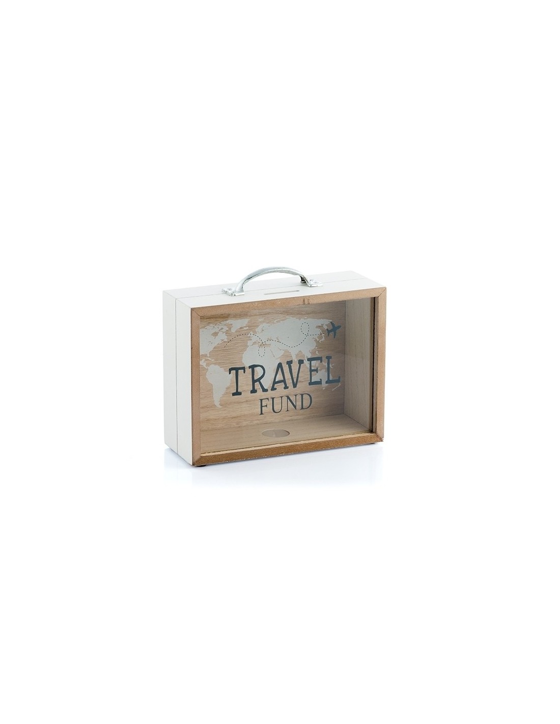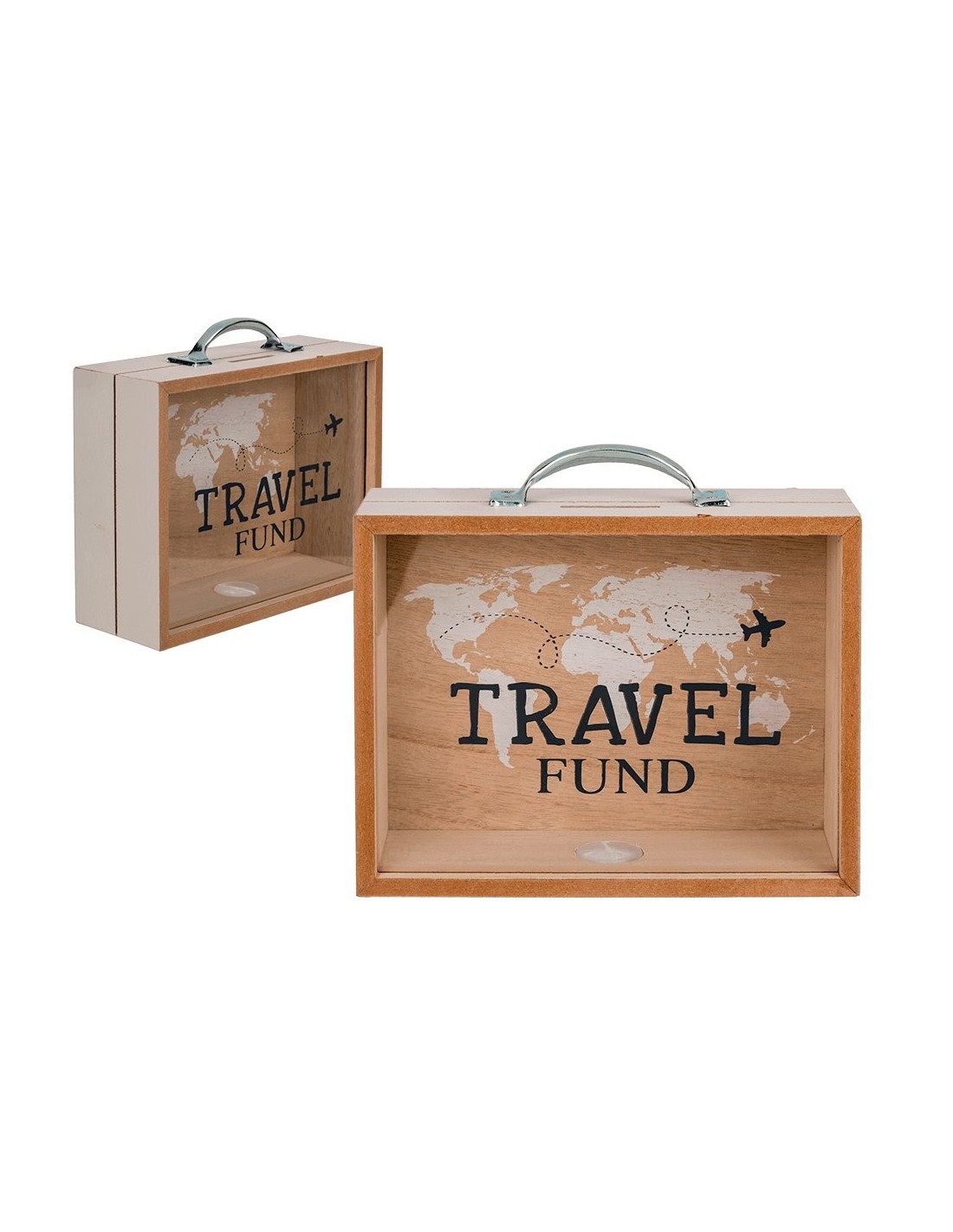 Original hucha de madera en forma de maleta. Ideal para ahorrar para las vacaciones.