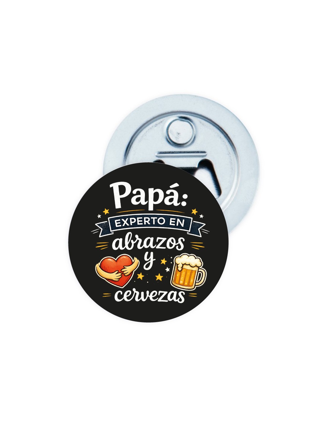 Original abridor de metal con imán decorado con el mensaje "papá: experto en abrazos y cervezas".