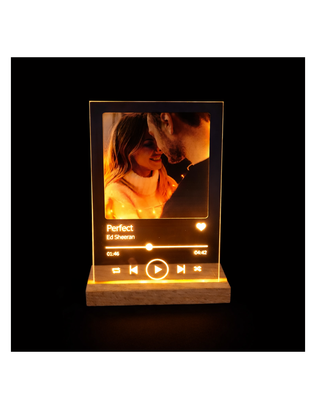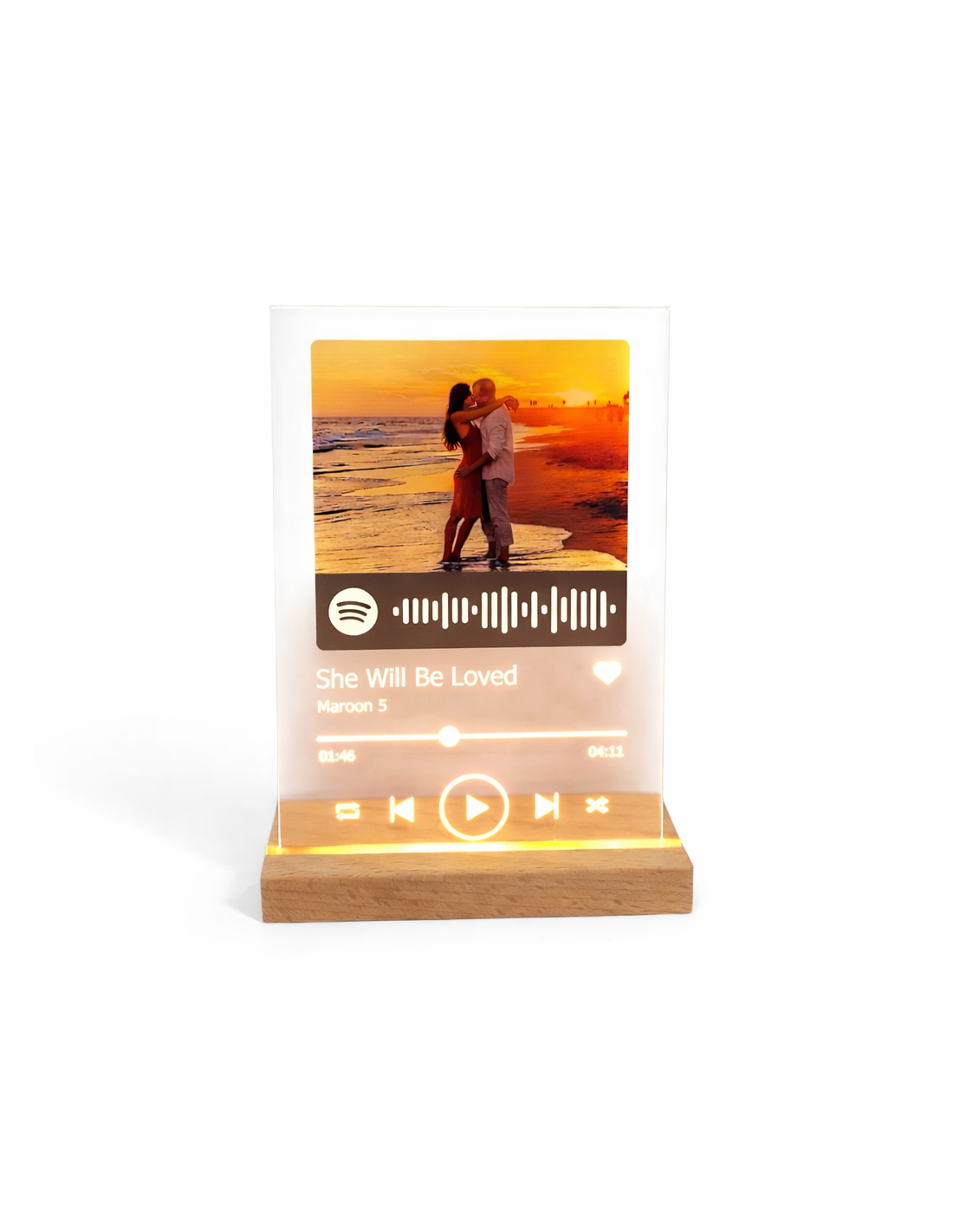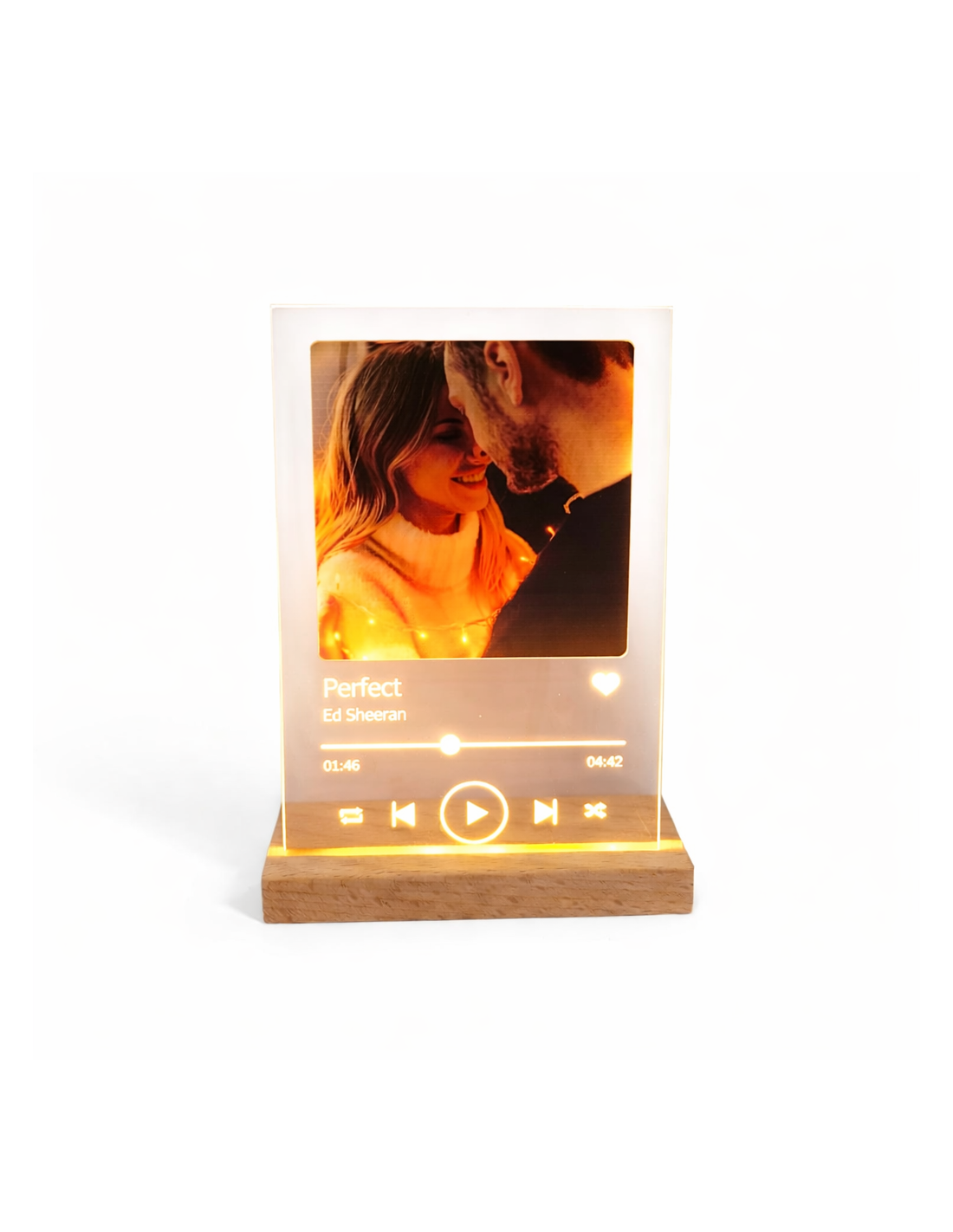 ¿Quieres sorprender con un regalo único y original? Imprime tu foto y canción favorita sobre un metacrilato. Incluye soporte de madera con luz.