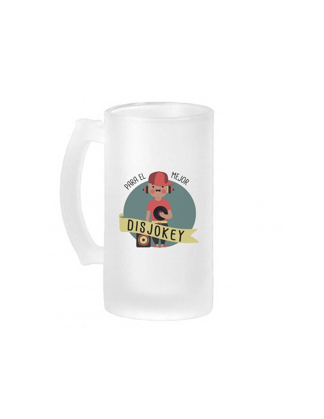 Original jarra de cerveza de vidrio esmerilado decorada con el mensaje "para el mejor disjokey".