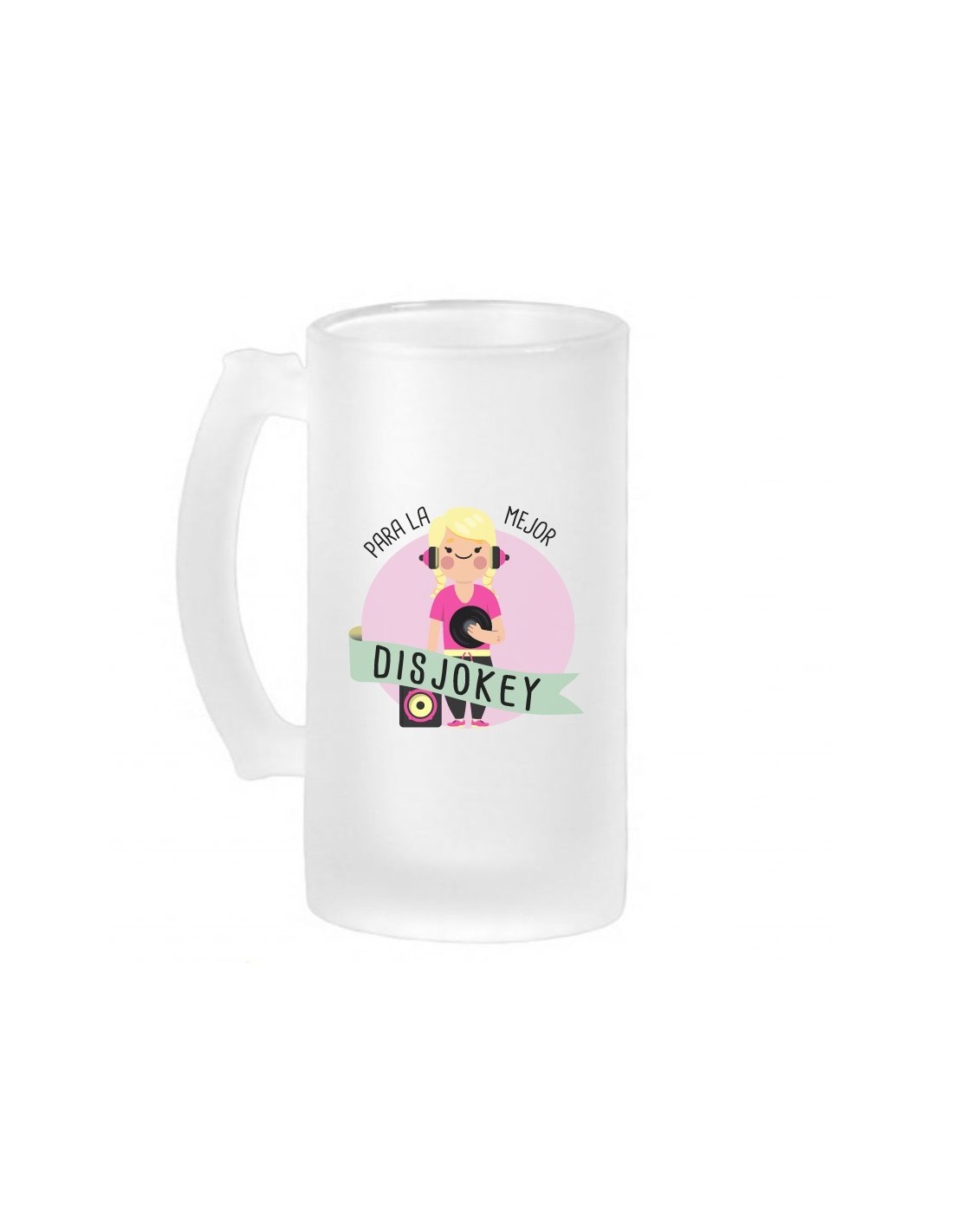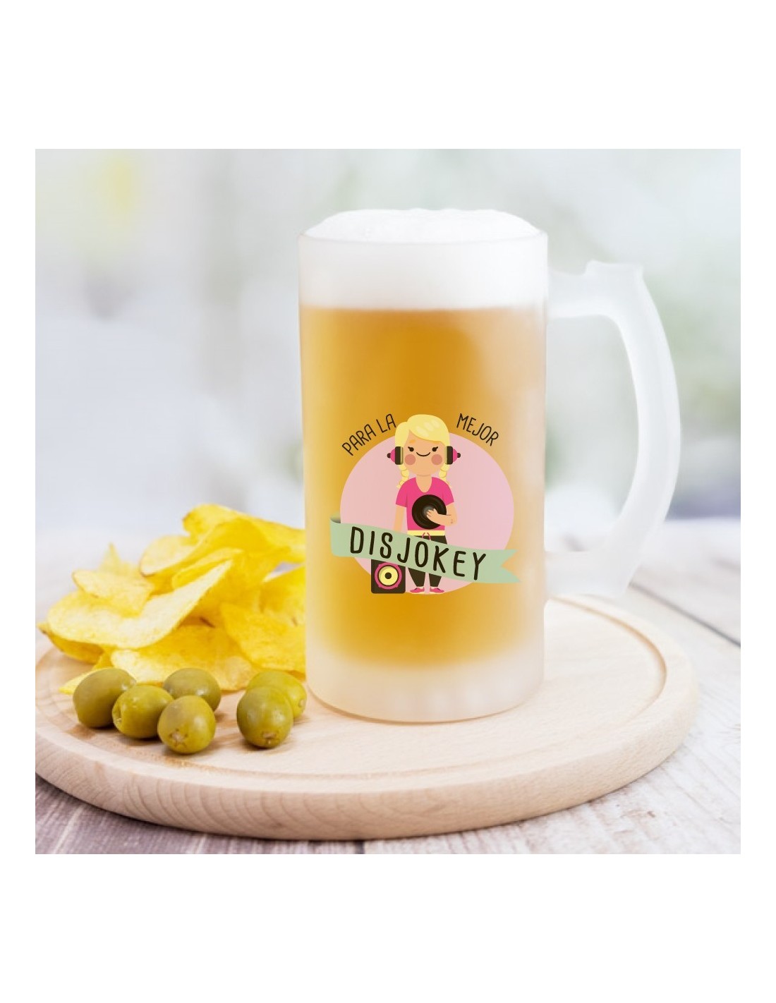 Original jarra de cerveza de vidrio esmerilado decorada con el mensaje "para la mejor disjokey".
