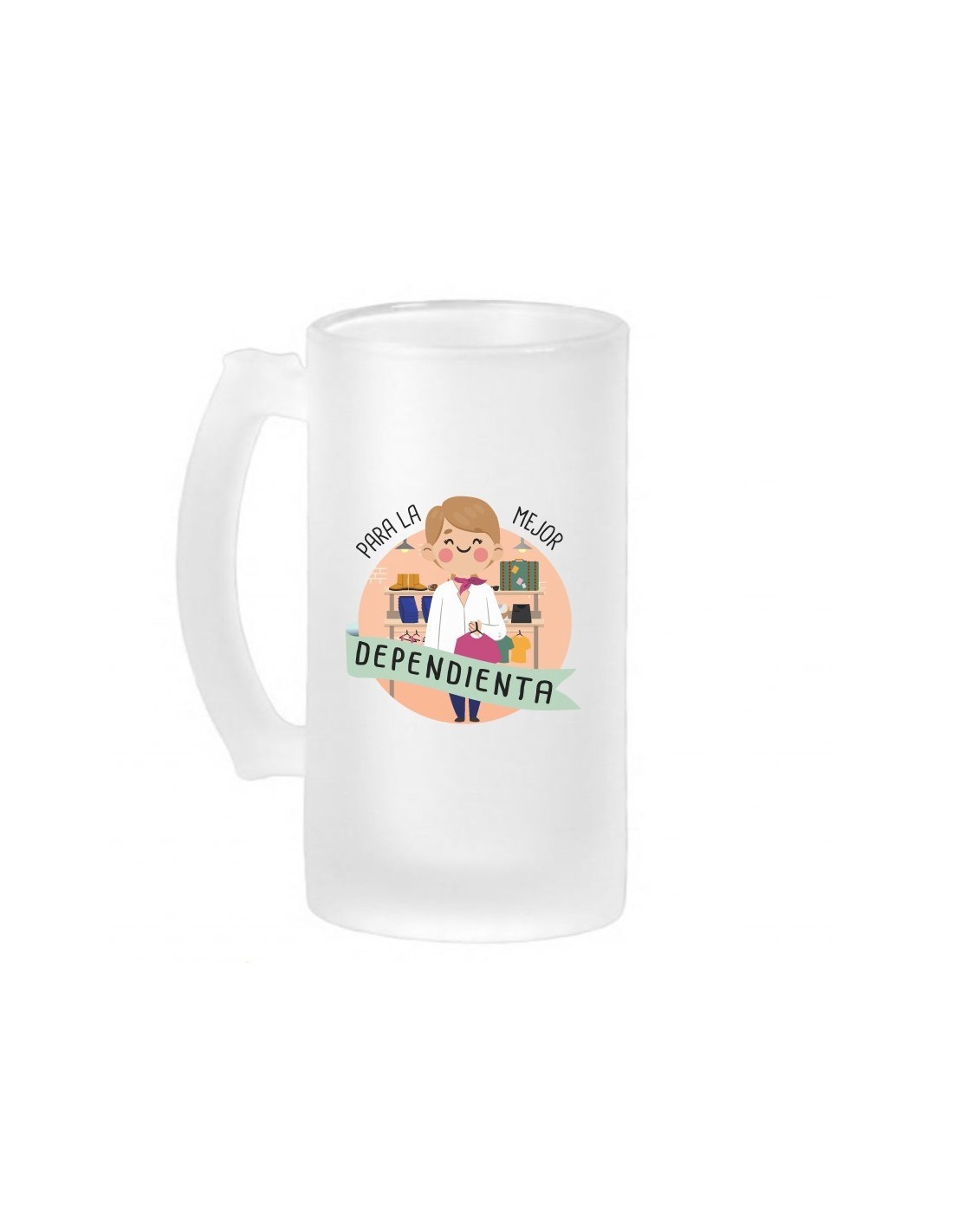 Original jarra de cerveza de vidrio esmerilado decorada con el mensaje "para la mejor dependienta".