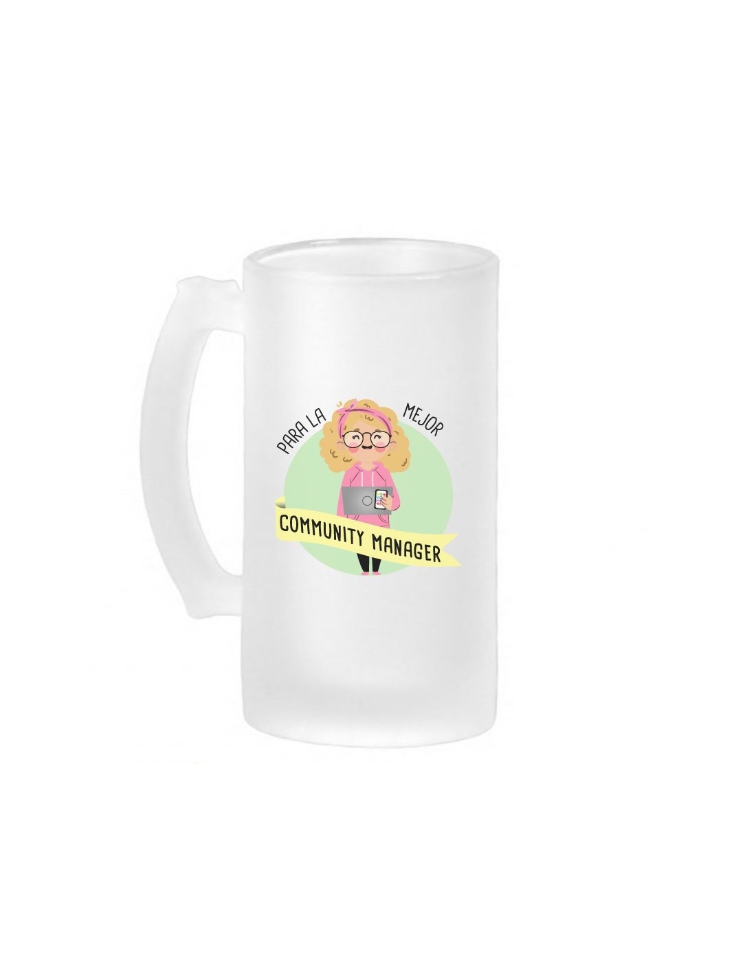 Original jarra de cerveza de vidrio esmerilado decorada con el mensaje "para la mejor community manager".