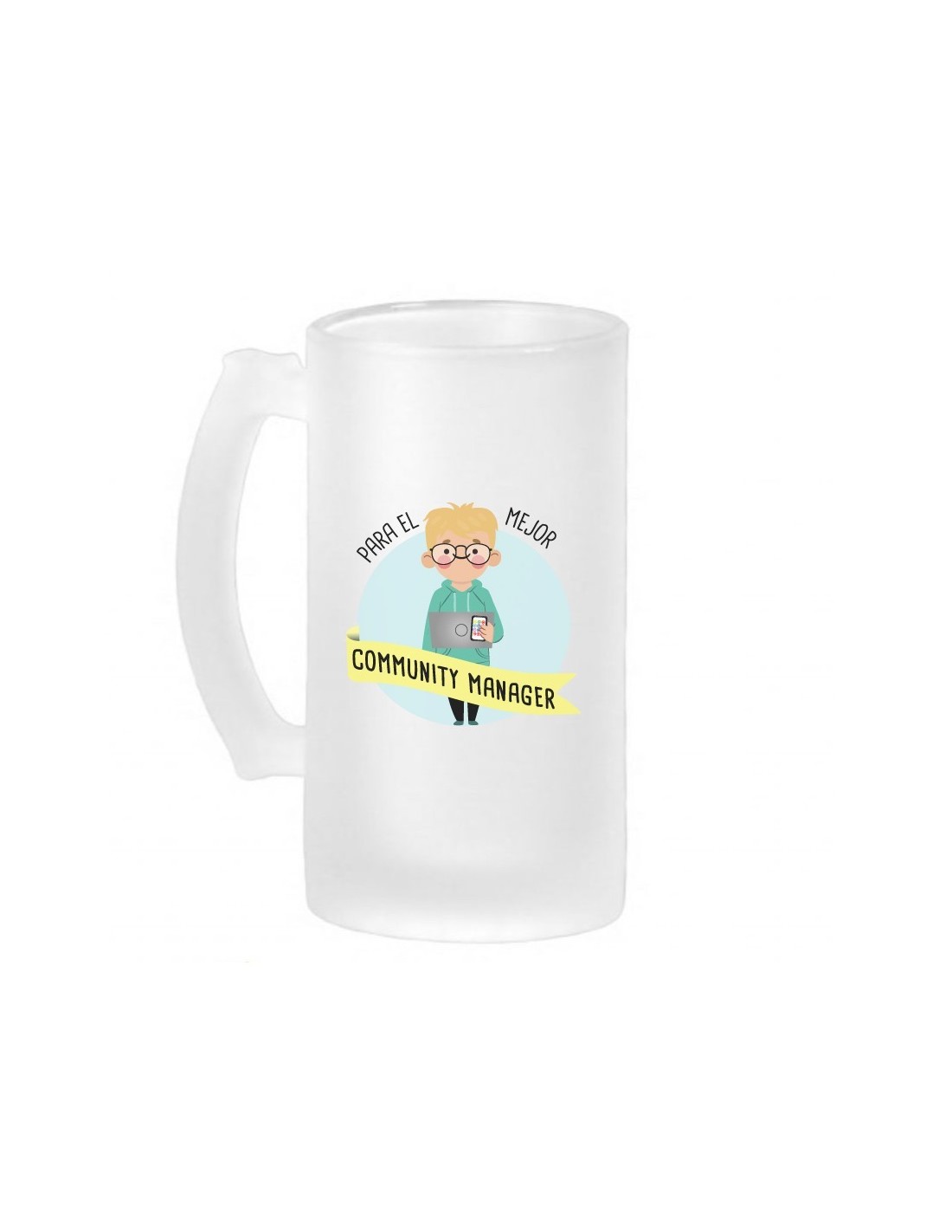 Original jarra de cerveza de vidrio esmerilado decorada con el mensaje "para el mejor community manager".