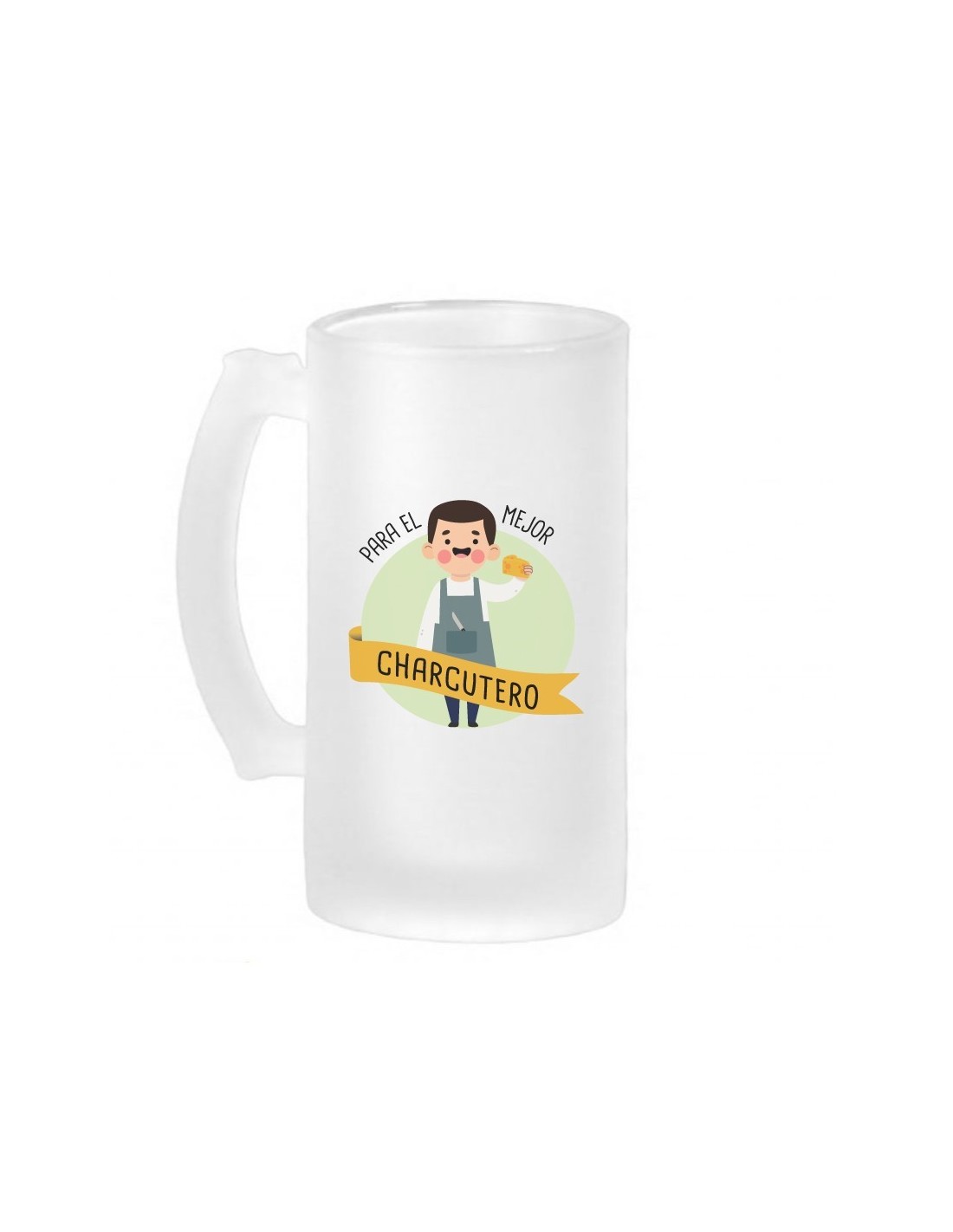 Original jarra de cerveza de vidrio esmerilado decorada con el mensaje "para el mejor charcutero".