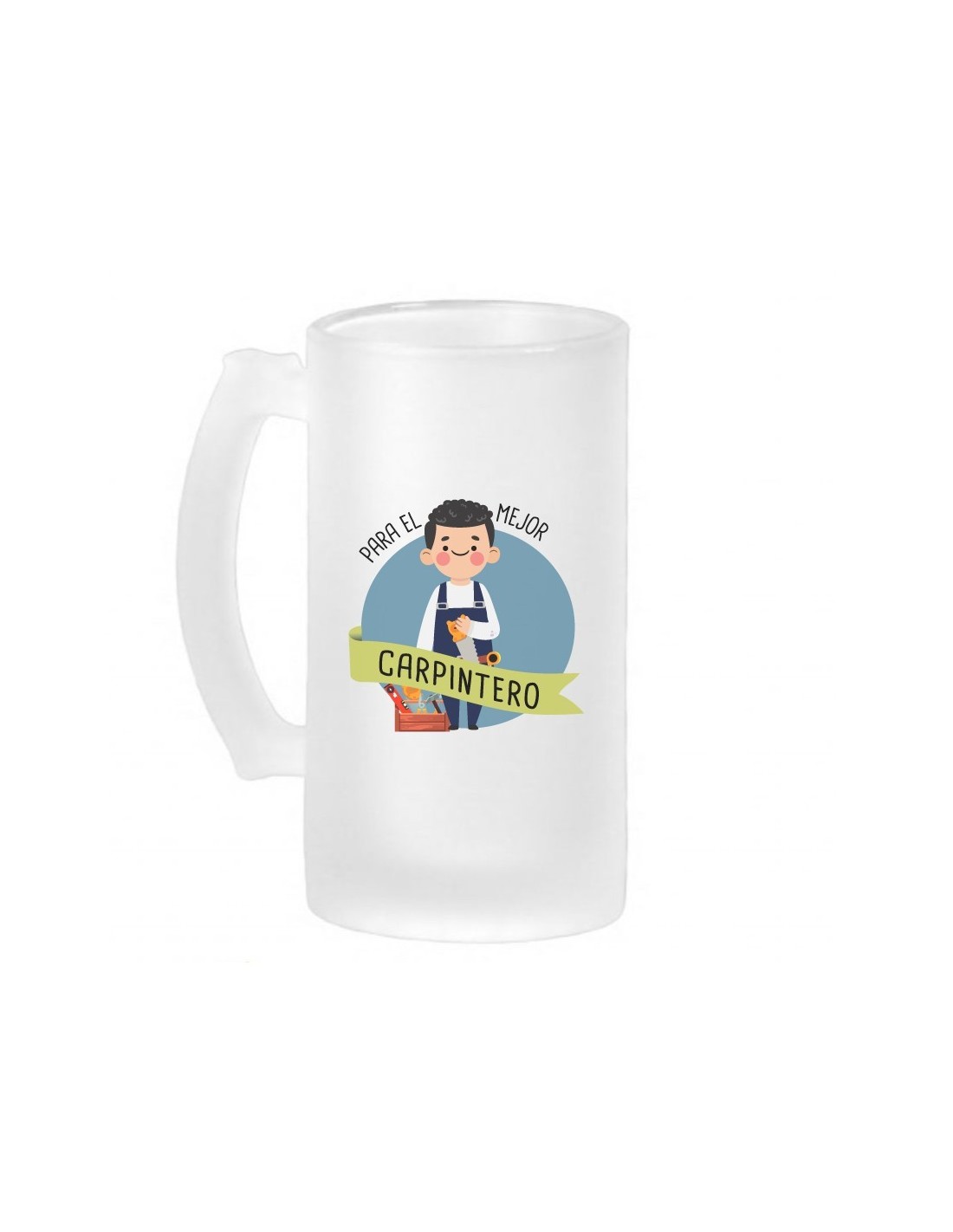 Original jarra de cerveza de vidrio esmerilado decorada con el mensaje "para el mejor carpintero".