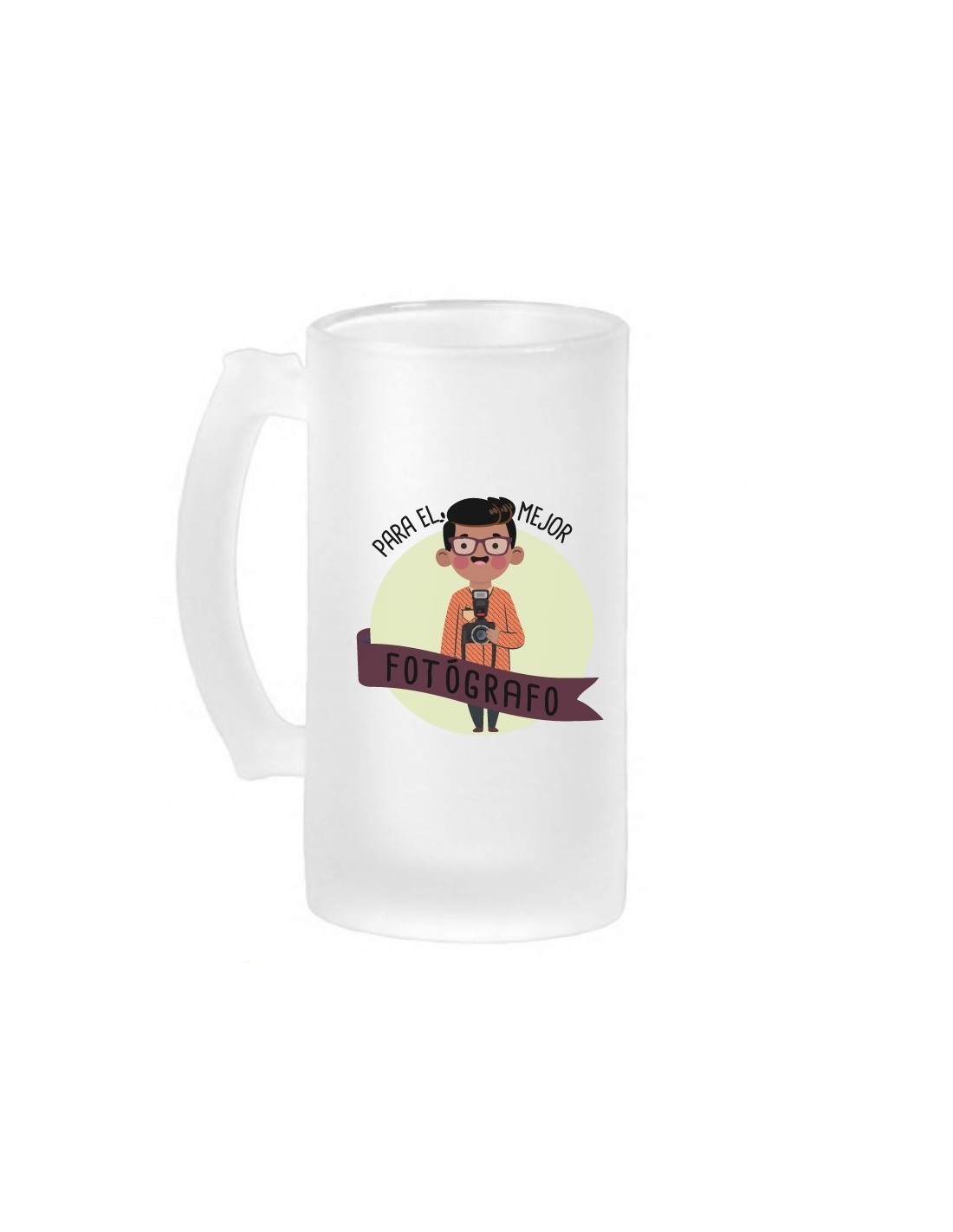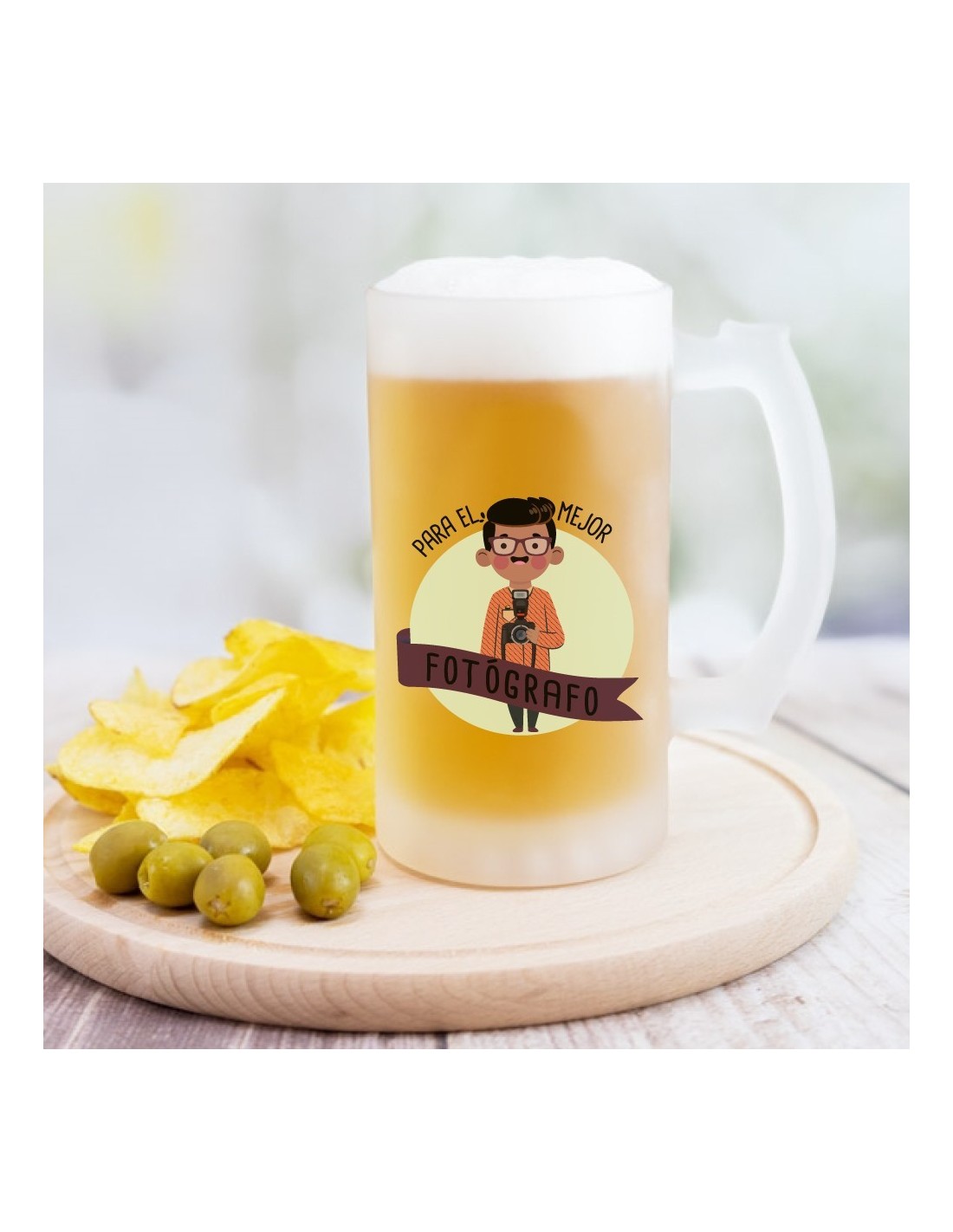 Original jarra de cerveza de vidrio esmerilado decorada con el mensaje "para el mejor fotógrafo".