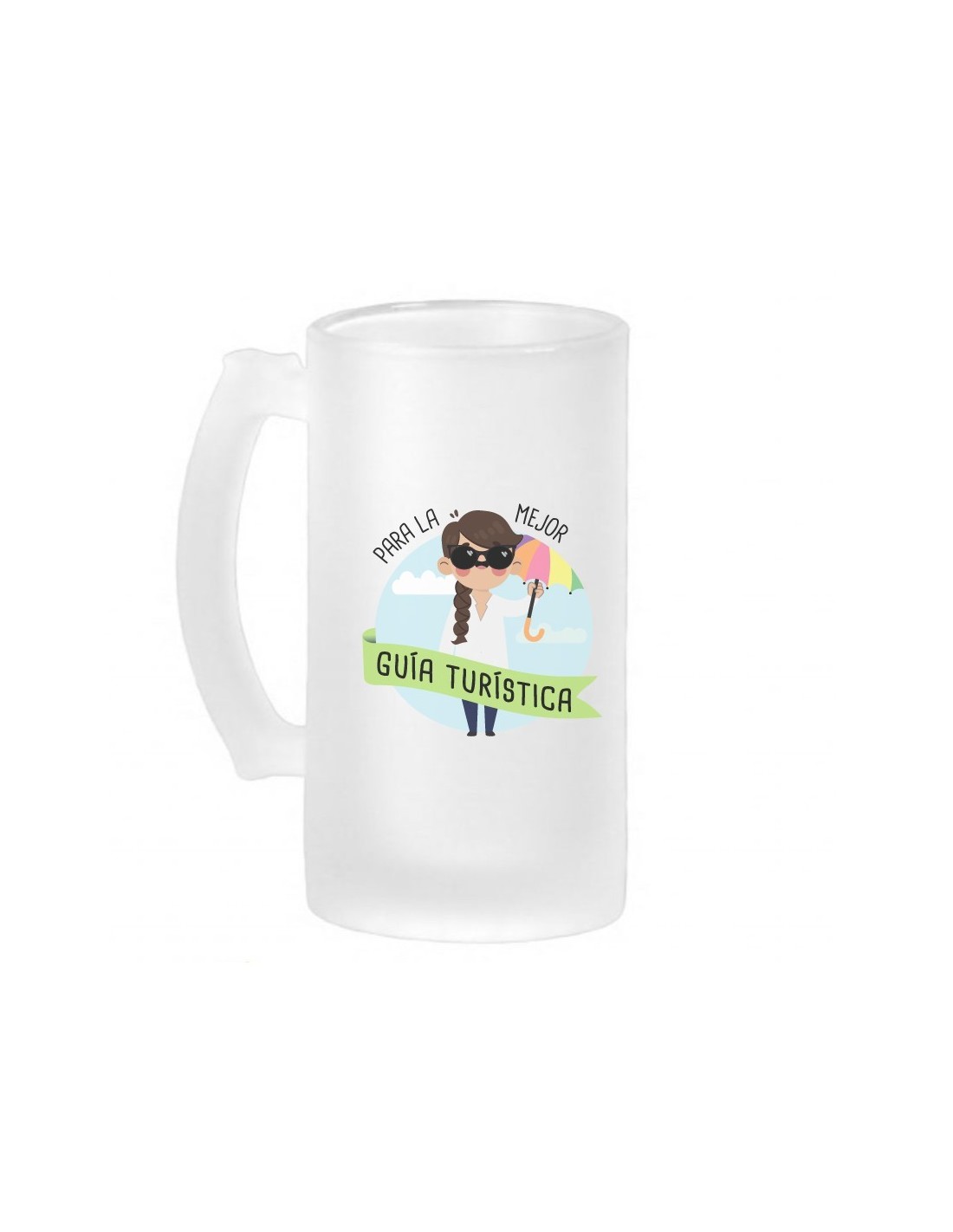 Original jarra de cerveza de vidrio esmerilado decorada con el mensaje "para la mejor guía turística".