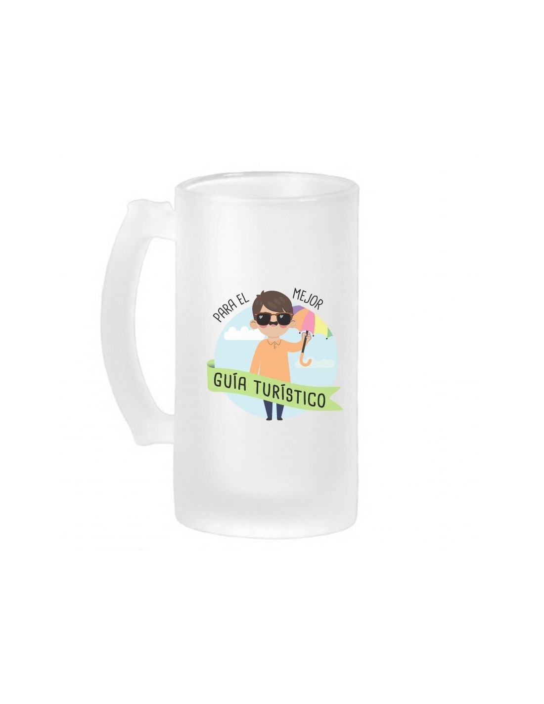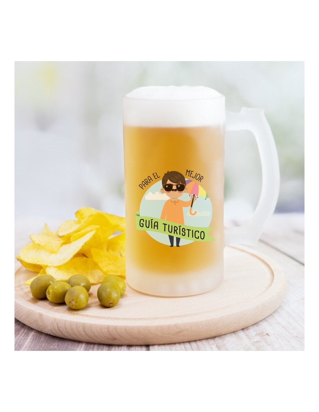 Original jarra de cerveza de vidrio esmerilado decorada con el mensaje "para el mejor guía turístico".
