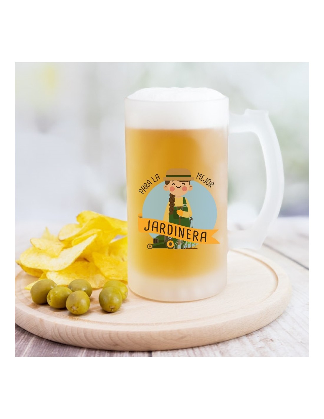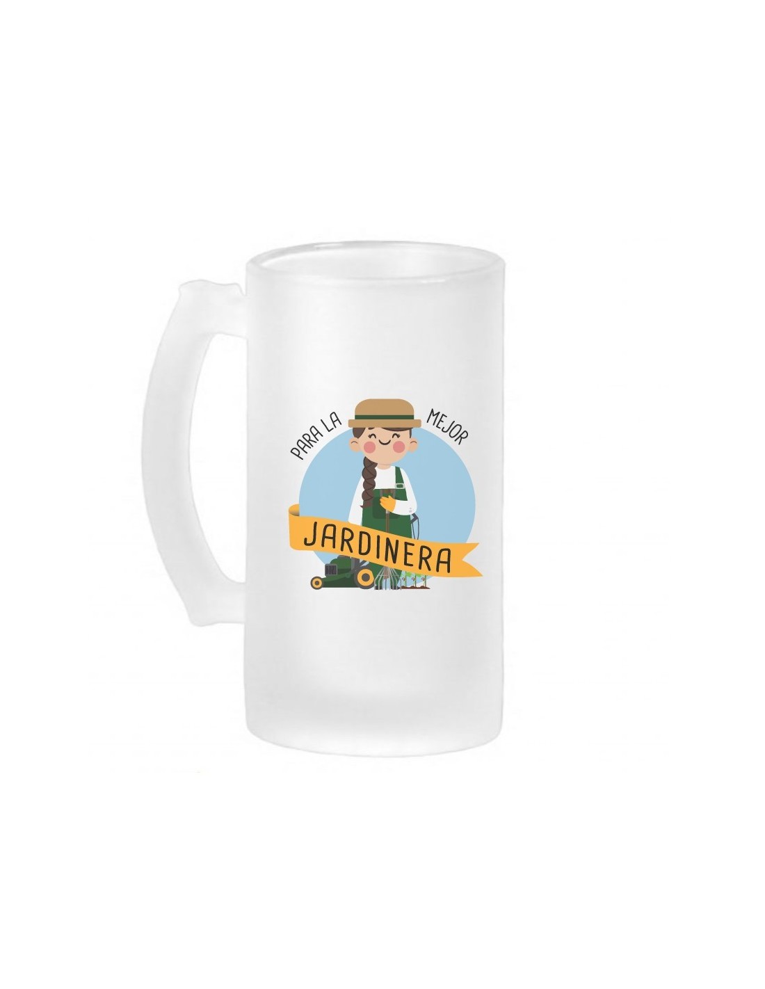 Original jarra de cerveza de vidrio esmerilado decorada con el mensaje "para la mejor jardinera".