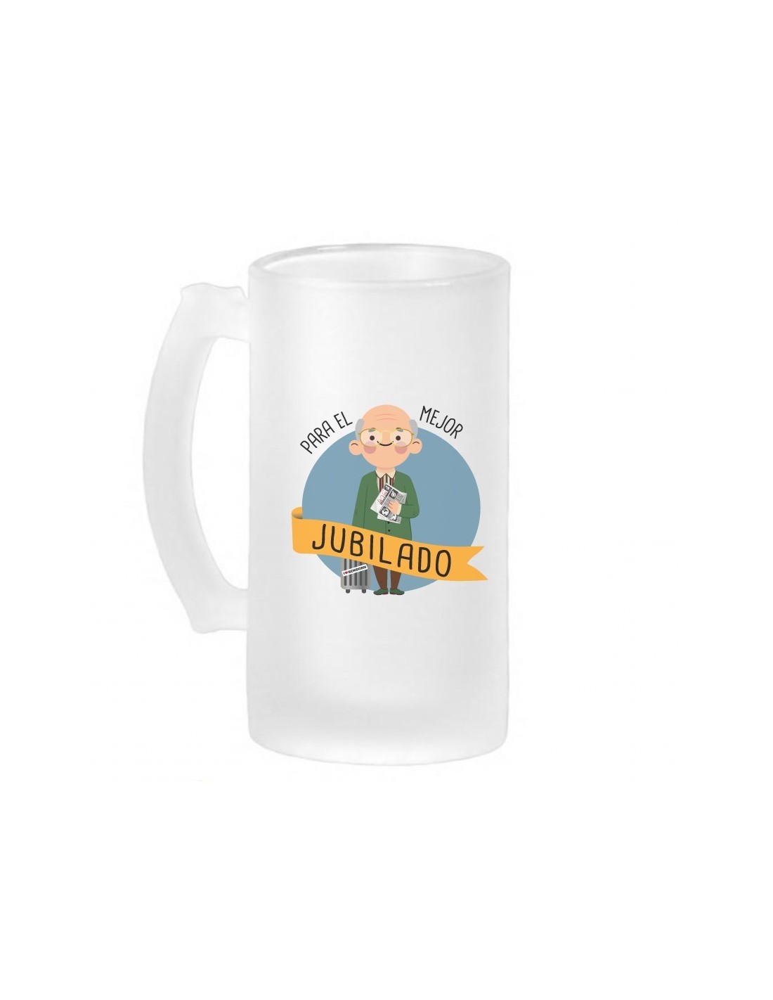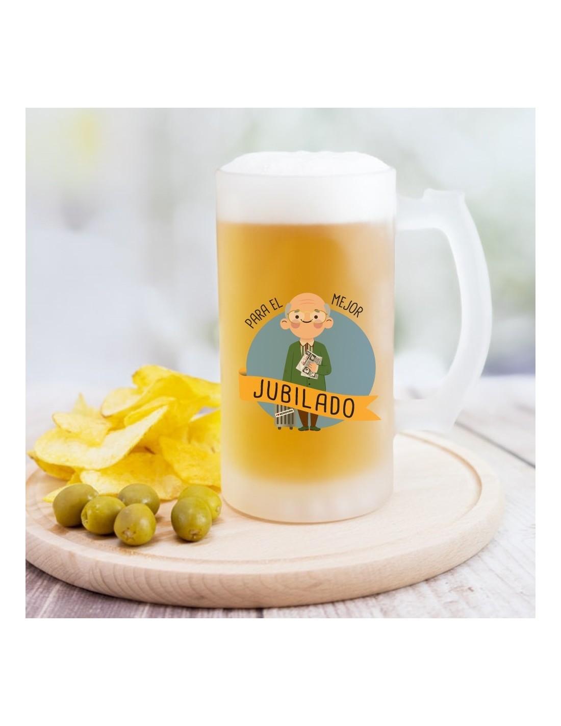 Original jarra de cerveza de vidrio esmerilado decorada con el mensaje "para el mejor jubilado".