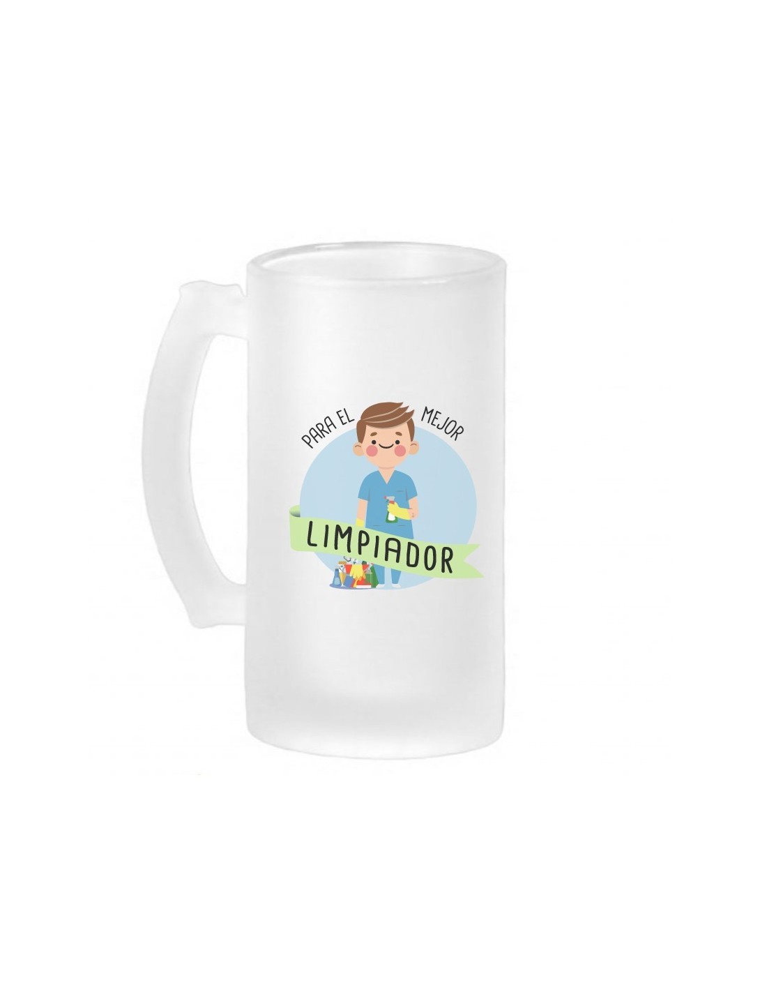 Original jarra de cerveza de vidrio esmerilado decorada con el mensaje "para el mejor limpiador".
