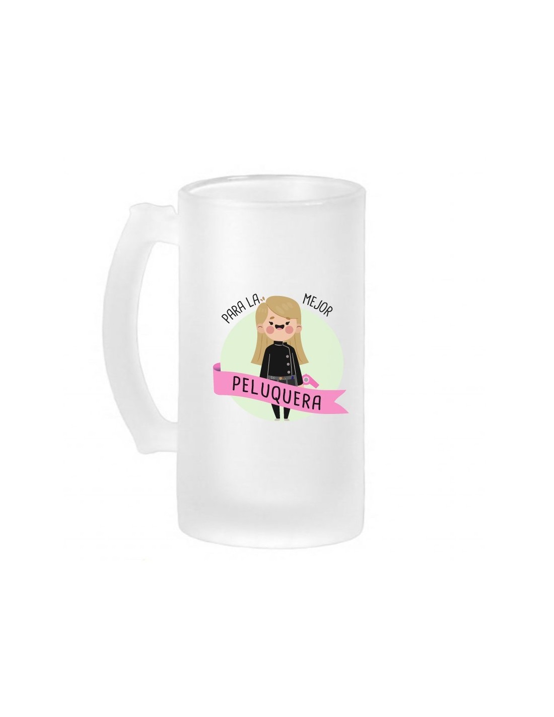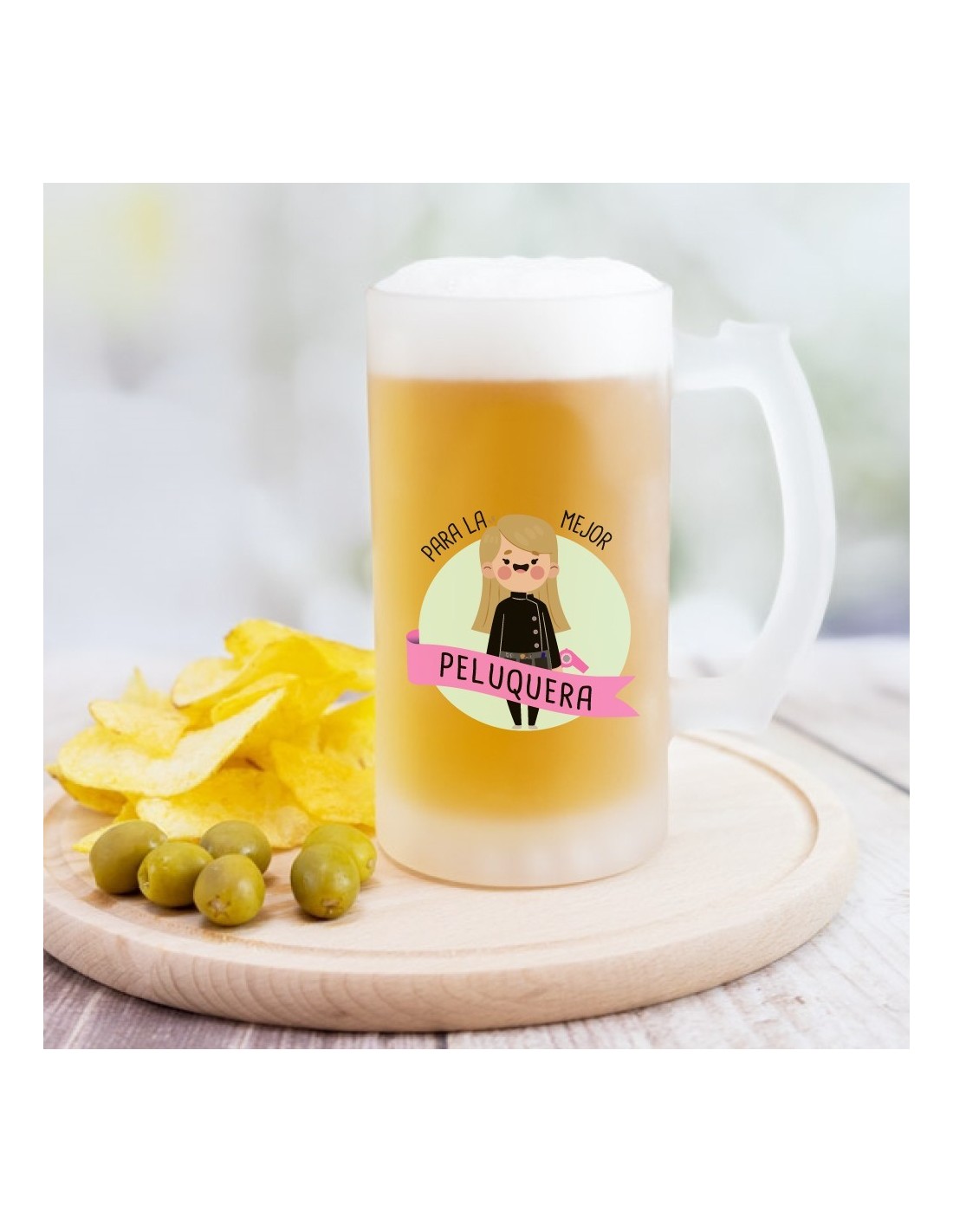 Original jarra de cerveza de vidrio esmerilado decorada con el mensaje "para la mejor peluquera".
